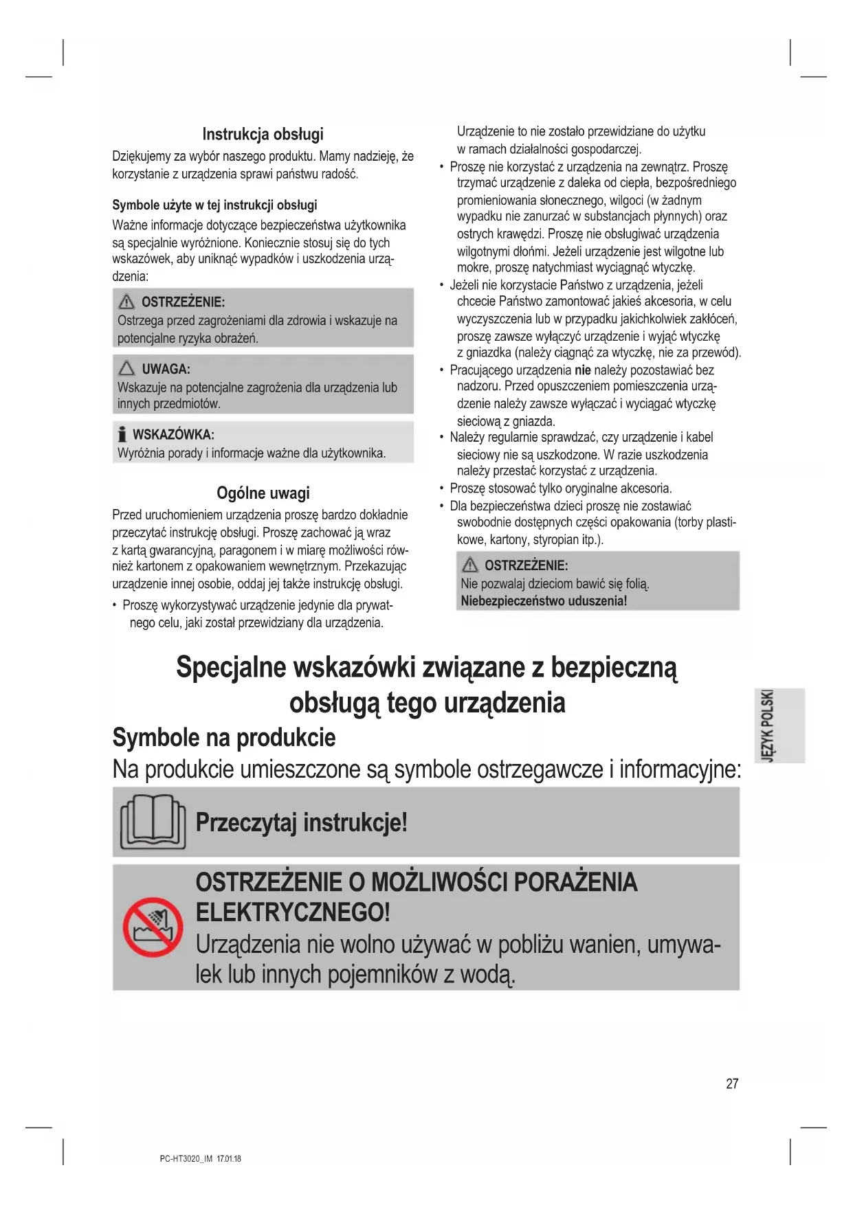 - Dla bezpieczeństwa dzieci proszę nie zostawiać swobodnie dostępnych części opakowania (torby plasti- kowe, kartony, styropian itp.). OSTRZEŻENIE: Nie pozwalaj dzieciom bawić się folią. Niebezpieczeństwo uduszenia! Specjalne wskazówki związane z bezpieczną obsługą tego urządzenia Symbole na produkcie Na produkcie umieszczone są symbole ostrzegawcze i informacyjne: Przeczytaj instrukcje! OSTRZEŻENIE O MOŻLIWOŚCI PORAŻENIA ELEKTRYCZNEGO! Urządzenia nie wolno używać w pobliżu wanien, umywa- lek lub innych pojemników z wodą.28 PC-HT3020_IM 17.01.18 OSTRZEŻENIE: