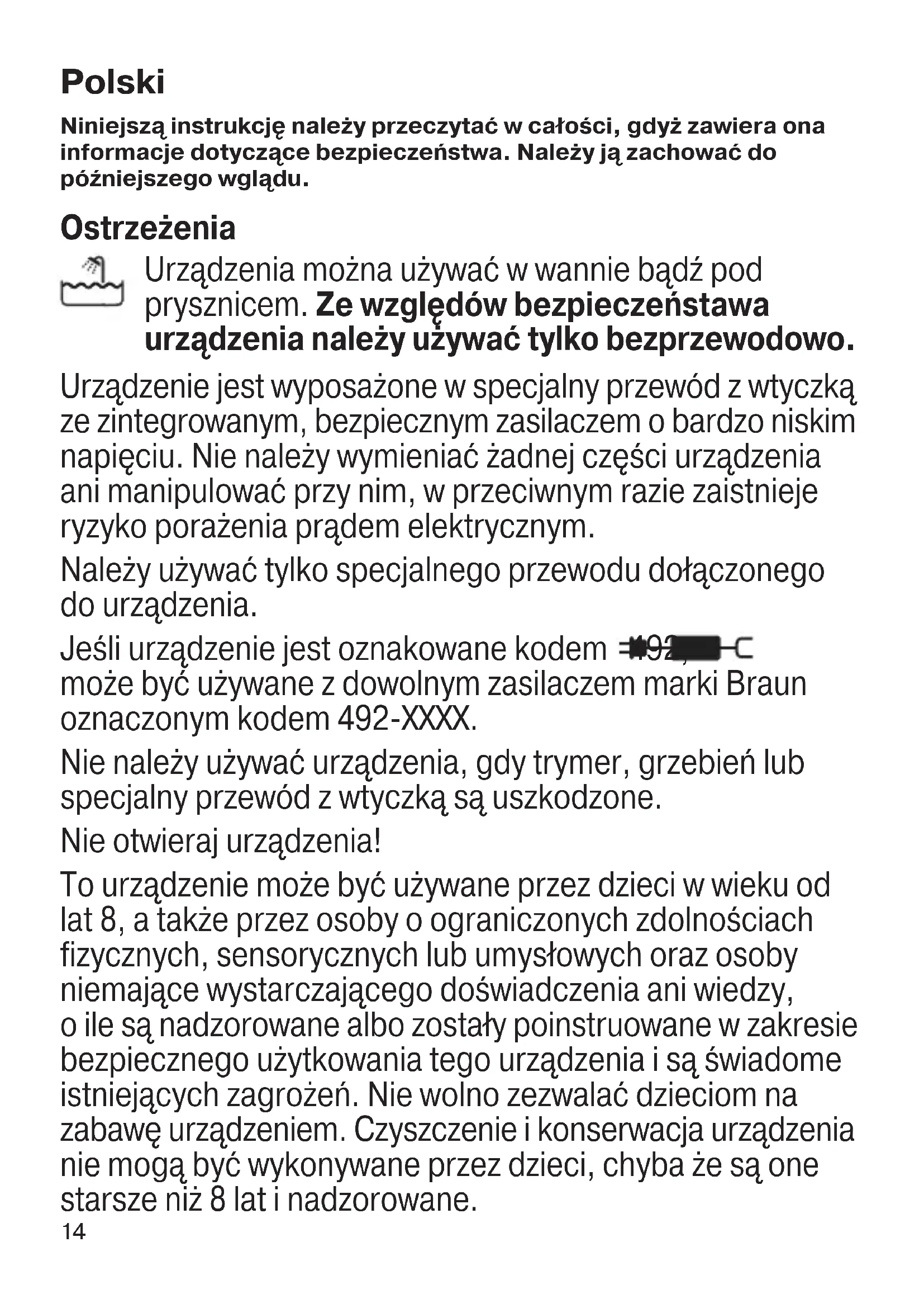 - Pour préserver le bon fonctionnement des accessoires, appliquez régu- lièrement une goutte d’huile de machine légère (non fournie) sur la ton- deuse et les grilles. Note environnementale Ce produit contient des piles et/ou des déchets électriques recyclables. Pour la protection de l’environnement, ne pas jeter avec les ordures ménagères, mais les porter dans les points de recyclage de déchets électriques disponibles dans votre pays. Sujet à des modifications sans préavis. Garantie Nous accordons une garantie de 2 ans sur ce produit, à partir de la date d’achat. Pendant la durée de la garantie, Braun prendra gratuitement à sa charge la réparation des vices de fabrication ou de matière en se réservant le droit de décider si certaines pièces doivent être réparées ou si l’appareil lui-même doit être échangé. Cette garantie s’étend à tous les pays où cet appareil est commercialisé par Braun ou son distributeur exclusif. Cette garantie ne couvre pas : les dommages occasionnés par une utilisation inadéquate, l’usure normale (par exemple, grille et bloc-couteaux) ainsi que les défauts d’usures qui ont un effet négligeable sur la valeur ou 91973553_MGK7021_7020_7920_MGK5080_CEEMEA.indd 1291973553_MGK7021_7020_7920_MGK5080_CEEMEA.indd 12 17.08.18 09:0517.08.18 09:05 Business Use - P&G AUTHORIZED POA-00067294 Rev 001 Effective Date 2018-08-20 Printed 2019-02-27 Page 12 of 8013 l’utilisation de l’appareil. Cette garantie devient caduque si des réparations ont été effectuées par des personnes non agréées par Braun et si des pièces de rechange ne provenant pas de Braun ont été utilisées. Pour toute réclamation intervenant pendant la période de garantie, retournez ou rapportez l’appareil ainsi que l’attestation de garantie à votre revendeur ou à un Centre Service Agréé Braun. Veuillez vous référer à www.service.braun.com ou appeler le 0 800 944 802 (service consommateurs – service & appel gratuits) pour connaître le Centre Service Agréé Braun le plus proche de chez vous. Clause spéciale pour la France Outre la garantie contractuelle exposée ci-dessus, nos clients bénéficient de la garantie légale des vices caches prévue aux articles 1641 et suivants du Code civil. 91973553_MGK7021_7020_7920_MGK5080_CEEMEA.indd 1391973553_MGK7021_7020_7920_MGK5080_CEEMEA.indd 13 17.08.18 09:0517.08.18 09:05 Business Use - P&G AUTHORIZED POA-00067294 Rev 001 Effective Date 2018-08-20 Printed 2019-02-27 Page 13 of 8014 Polski Niniejszą instrukcję należy przeczytać w całości, gdyż zawiera ona informacje dotyczące bezpieczeństwa. Należy ją zachować do późniejszego wglądu. Ostrzeżenia Urządzenia można używać w wannie bądź pod prysznicem. Ze względów bezpieczeństawa urządzenia należy używać tylko bezprzewodowo. Urządzenie jest wyposażone w specjalny przewód z wtyczką ze zintegrowanym, bezpiecznym zasilaczem o bardzo niskim napięciu. Nie należy wymieniać żadnej części urządzenia ani manipulować przy nim, w przeciwnym razie zaistnieje ryzyko porażenia prądem elektrycznym. Należy używać tylko specjalnego przewodu dołączonego do urządzenia. Jeśli urządzenie jest oznakowane kodem 492, może być używane z dowolnym zasilaczem marki Braun oznaczonym kodem 492-XXXX. Nie należy używać urządzenia, gdy trymer, grzebień lub specjalny przewód z wtyczką są uszkodzone. Nie otwieraj urządzenia! To urządzenie może być używane przez dzieci w wieku od lat 8, a także przez osoby o ograniczonych zdolnościach fizycznych, sensorycznych lub umysłowych oraz osoby niemające wystarczającego doświadczenia ani wiedzy, o ile są nadzorowane albo zostały poinstruowane w zakresie bezpiecznego użytkowania tego urządzenia i są świadome istniejących zagrożeń. Nie wolno zezwalać dzieciom na zabawę urządzeniem. Czyszczenie i konserwacja urządzenia nie mogą być wykonywane przez dzieci, chyba że są one starsze niż 8 lat i nadzorowane. 91973553_MGK7021_7020_7920_MGK5080_CEEMEA.indd 1491973553_MGK7021_7020_7920_MGK5080_CEEMEA.indd 14 17.08.18 09:0517.08.18 09:05 Business Use - P&G AUTHORIZED POA-00067294 Rev 001 Effective Date 2018-08-20 Printed 2019-02-27 Page 14 of 8015 Opis produktu 1a Wysuwany grzebień do zarostu (3–11 mm w odstępach 2 mm) 1b Wysuwany grzebień do włosów (13–21 mm w odstępach 2 mm) 1c Przycisk zwalniający wysuwane grzebienie 1d Grzebień 1 (1 mm) 1e Grzebień 2 (2 mm) 2a Głowica trymera 2b Głowica trymera do uszu i nosa* 2c Głowica precyzyjnego trymera* 2d Głowica maszynki do ciała* 2e Mała głowica golarki z folią* 3 Przycisk On/Off (Wł./Wył.) 4 Wskaźnik ładowania 5 Gniazdo zasilania 6 Specjalny przewód z wtyczką (konstrukcja wtyczki może się różnić 7 Podstawka do ładowania*