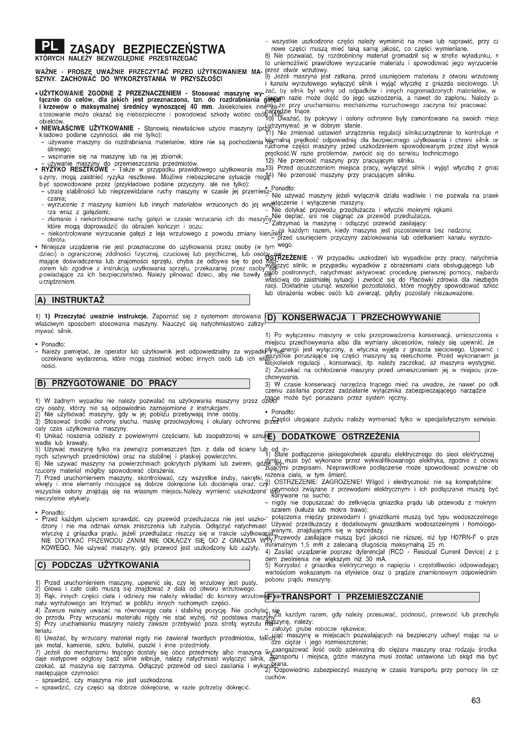 złamanie i niekontrolowane ruchy gałęzi w czasie wrzucania ich do maszyny, które mogą doprowadzić do obrażeń kończyn i oczu; – niekontrolowane wyrzucanie gałęzi z leja wrzutowego z powodu zmiany kierunku obrotu.