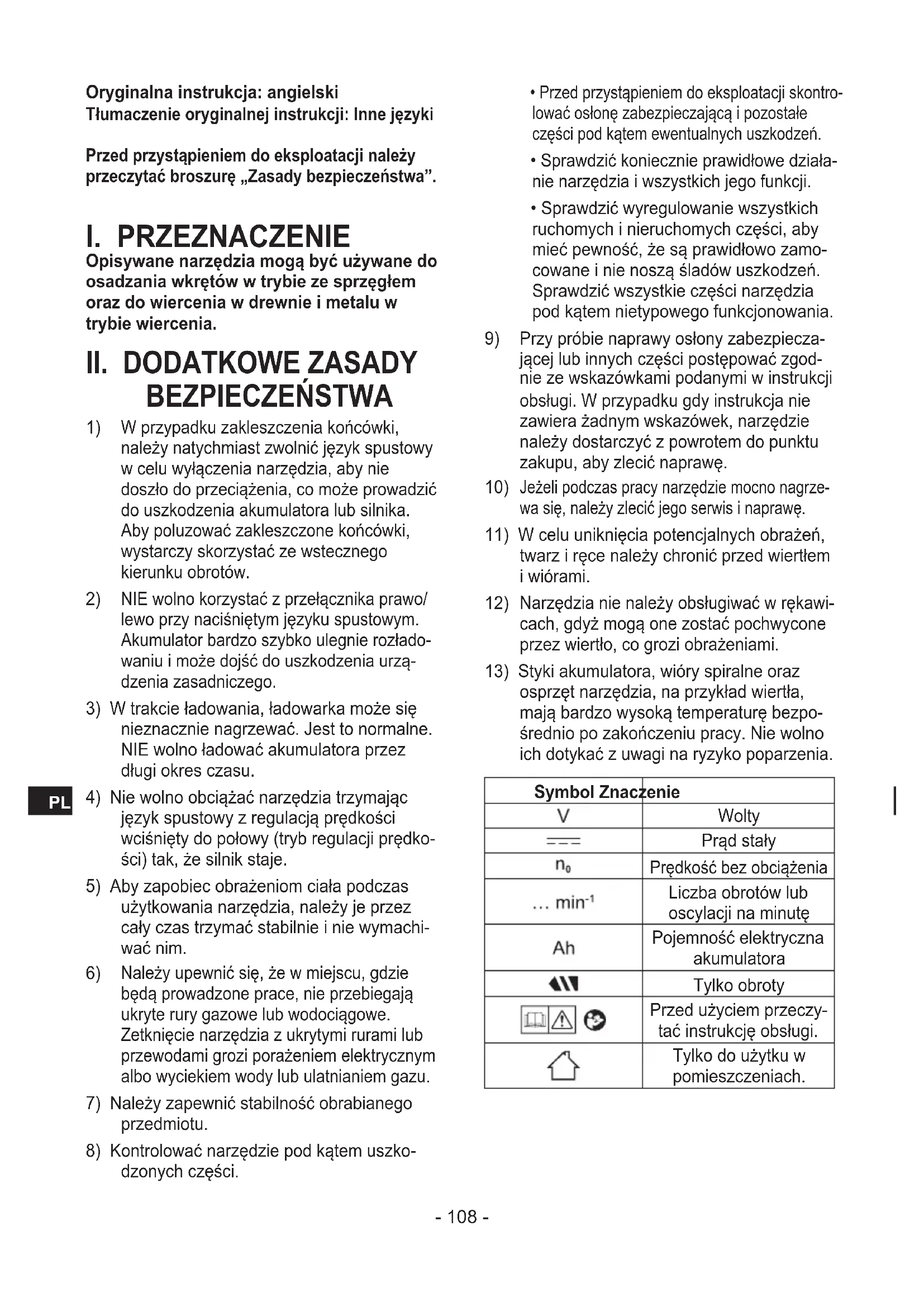 osprzęt narzędzia, na przykład wiertła, mają bardzo wysoką temperaturę bezpo- średnio po zakończeniu pracy. Nie wolno ich dotykać z uwagi na ryzyko poparzenia. Symbol Znaczenie Wolty Prąd stały Prędkość bez obciążenia Liczba obrotów lub oscylacji na minutę Pojemność elektryczna akumulatora Tylko obroty Przed użyciem przeczy- tać instrukcję obsługi. Tylko do użytku w pomieszczeniach.- 109 -