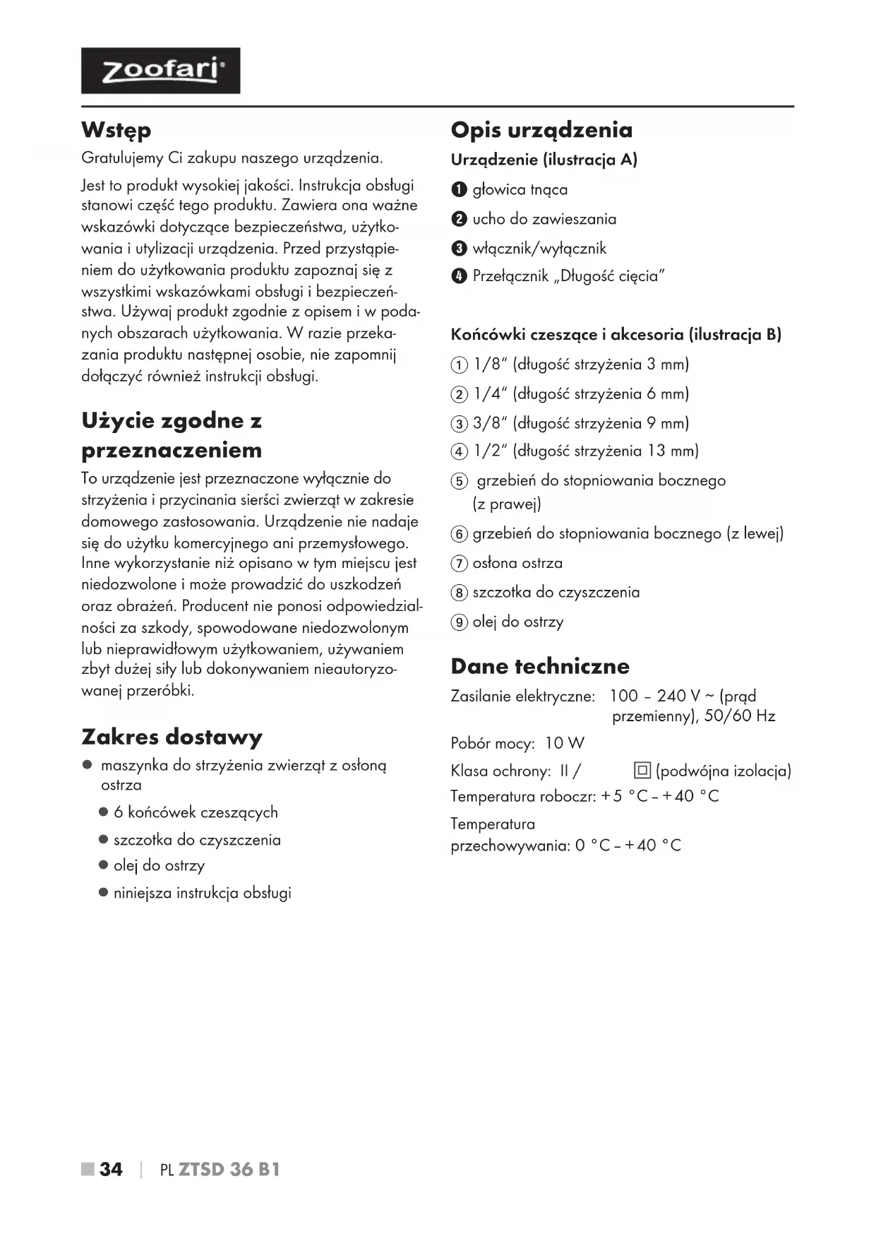 maszynka do strzyżenia zwierząt z osłoną ostrza ▯ 6 końcówek czeszących ▯ szczotka do czyszczenia ▯ olej do ostrzy ▯ niniejsza instrukcja obsługi Opis urządzenia Urządzenie (ilustracja A) 1 głowica tnąca 2 ucho do zawieszania 3 włącznik/wyłącznik 4 Przełącznik „Długość cięcia” Końcówki czeszące i akcesoria (ilustracja B) 1 1/8“ (długość strzyżenia 3 mm) 2 1/4“ (długość strzyżenia 6 mm) 3 3/8“ (długość strzyżenia 9 mm) 4 1/2“ (długość strzyżenia 13 mm) 5 grzebień do stopniowania bocznego (z prawej) 6 grzebień do stopniowania bocznego (z lewej) 7 osłona ostrza 8 szczotka do czyszczenia 9 olej do ostrzy Dane techniczne Zasilanie elektryczne: 100 – 240 V ∼ (prąd przemienny), 50/60 Hz Pobór mocy: 10 W Klasa ochrony: II / (podwójna izolacja) Temperatura roboczr: + 5°C – + 40°C Temperatura przechowywania: 0°C – + 40°C IB_315533_ZTSD36B1_LB8.indb 34 22.01.19 12:33PL
