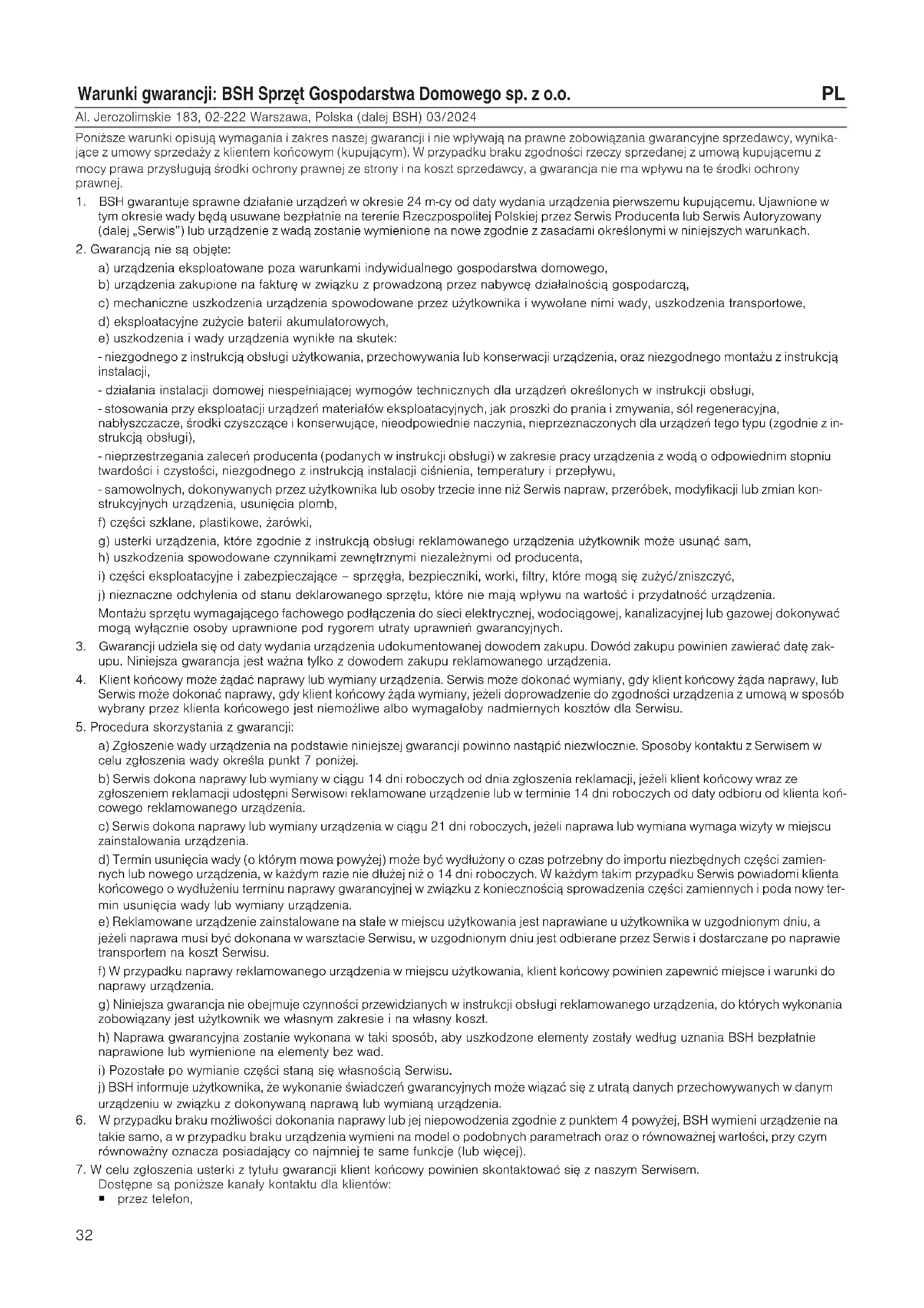 Al. Jerozolimskie 183, 02-222 Warszawa, Polska (dalej BSH) 03/2024 Poniższe warunki opisują wymagania i zakres naszej gwarancji i nie wpływają na prawne zobowiązania gwarancyjne sprzedawcy, wynika- jące z umowy sprzedaży z klientem końcowym (kupującym). W przypadku braku zgodności rzeczy sprzedanej z umową kupującemu z mocy prawa przysługują środki ochrony prawnej ze strony i na koszt sprzedawcy, a gwarancja nie ma wpływu na te środki ochrony prawnej. 1. BSH gwarantuje sprawne działanie urządzeń w okresie 24 m-cy od daty wydania urządzenia pierwszemu kupującemu. Ujawnione w tym okresie wady będą usuwane bezpłatnie na terenie Rzeczpospolitej Polskiej przez Serwis Producenta lub Serwis Autoryzowany (dalej „Serwis”) lub urządzenie z wadą zostanie wymienione na nowe zgodnie z zasadami określonymi w niniejszych warunkach.
