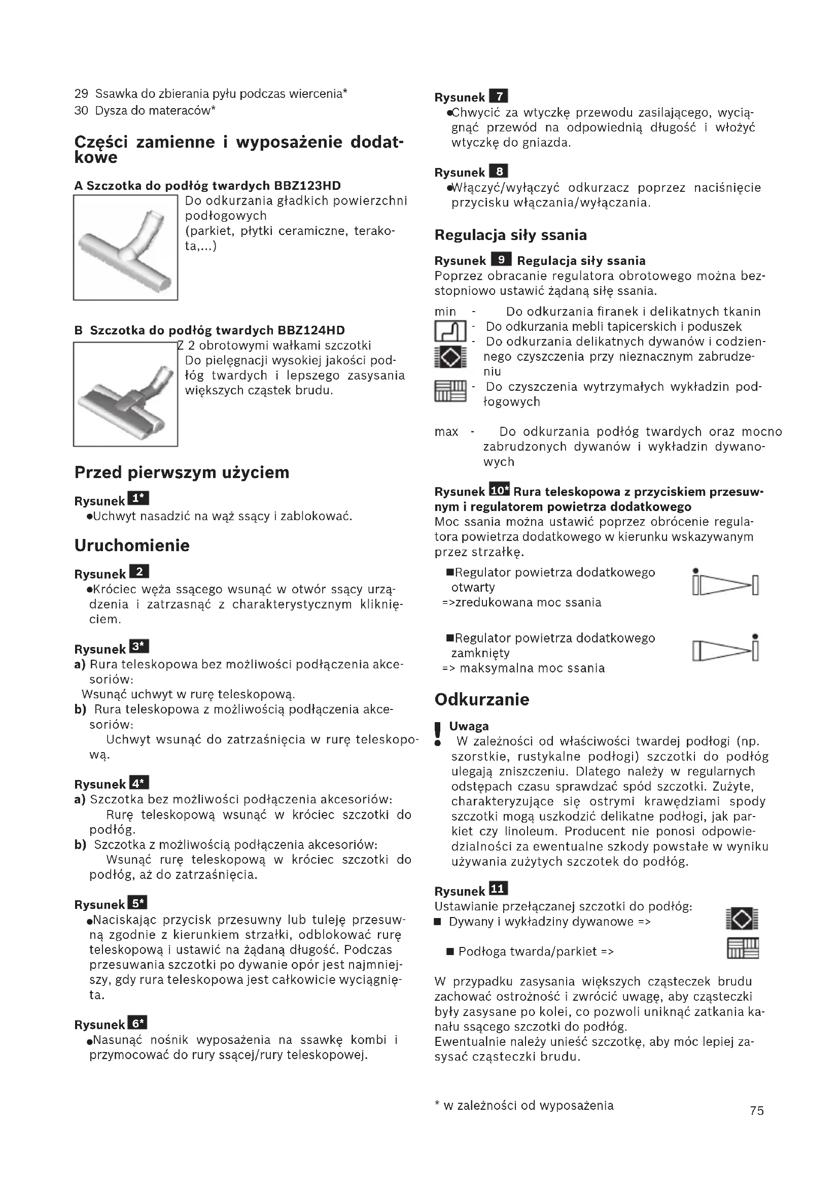- w zależności od wyposażenia75 29 Ssawka do zbierania pyłu podczas wiercenia* 30 Dysza do materaców* Części zamienne i wyposażenie dodat- kowe A Szczotka do podłóg twardych BBZ123HD Do odkurzania gładkich powierzchni podłogowych (parkiet, płytki ceramiczne, terako- ta,...) B Szczotka do podłóg twardych BBZ124HD Z 2 obrotowymi wałkami szczotki Do pielęgnacji wysokiej jakości pod- łóg twardych i lepszego zasysania większych cząstek brudu. Przed pierwszym użyciem Rysunek