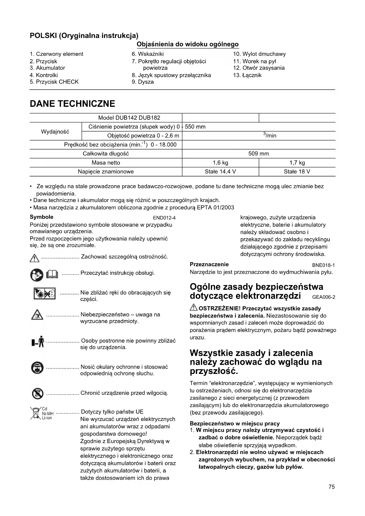 OSTRZEŽENIA DOTYCZACE BEZPIECZNEJ EKSPLOATACJI DMUCHAWY AKUMULATOROWEJ / OGRODOWEJ DMUCHAWY AKUMULATOROWEJ / ODKURZACZA AKUMULATOROWEGO
