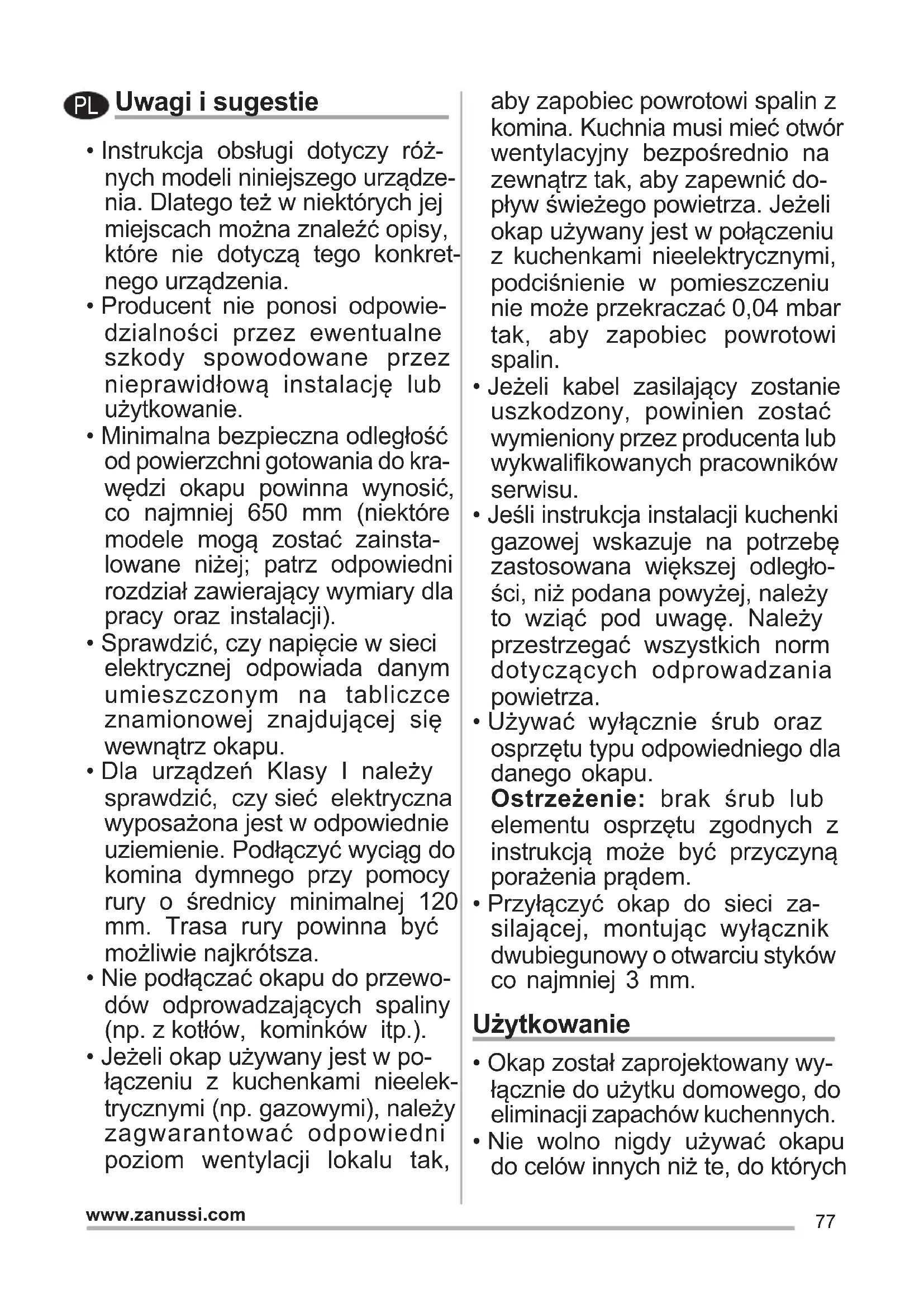 - Nie wolno nigdy używać okapu do celów innych niż te, do których PL78 www.zanussi.com został zaprojektowany.