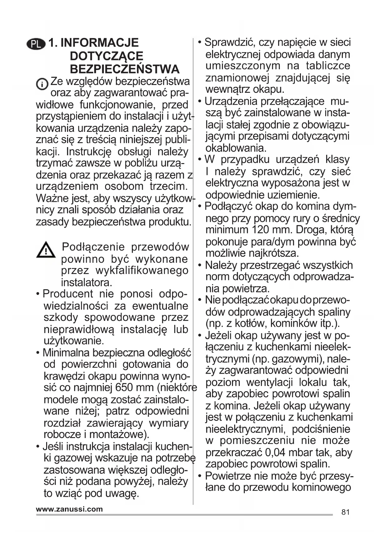 - Jeżeli okap używany jest jed- nocześnie z urządzeniami spa-83 www.zanussi.com lającymi gaz lub inne paliwa, w pomieszczeniu należy zapewnić odpowiednią wentylację (nie dotyczy urządzeń, które jedynie pobierają powietrze z pomiesz- czenia).