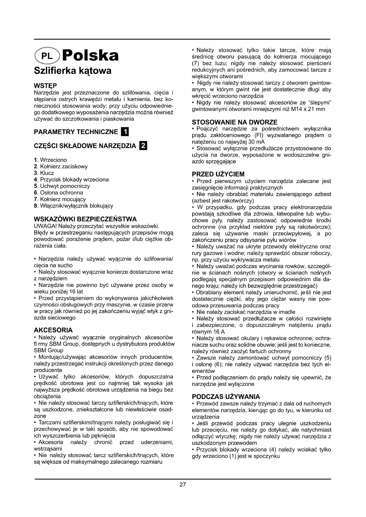 - Po wyłączeniu narzędzia nigdy nie należy zatrzymywać wirujących elementów działając na nie z bocznie przyłożoną siłą Urządzenie jest podwójnie izolowane zgodnie z normą EN 50144; dlatego też nie jest koniecz- ne jego uziemienie.KONSERWACJA Przed rozpoczęciem prac konserwacyjnych silnika należy upewnić się, że urządzenie nie znajduje się pod prądem. Urządzenia SBM Group zostały zaprojektowane do dzia- łania przez dłuższy okres czasu przy minimalnym nakła- dzie pracy związanym z konserwacją. Zadowalające działanie zależy od odpowiedniego dbania o urządzenie oraz regularnego czyszczenia. Należy regularnie czyścić obudowę urządzenia miękką szmatką, najlepiej po każdym użyciu. Należy dopilno- wać, aby otwory wentylacyjne nie były zatkane przez pył i brud. W przypadku, gdy brud nie daje się usunąć, należy użyć miękkiej szmatki zwilżonej wodą z mydłem. Nie wolno używać rozpuszczalników takich jak benzy-na, alkohol, woda z amoniakiem itd. Rozpuszczalniki te mogą uszkodzić części wykonane z plastiku. Urządzenie nie wymaga dodatkowego smarowania. W przypadku pojawienia się usterki, np. zużycia części, należy skontaktować się z najbliższym sprzedawcą SBM Group. ŚRODOWISKOW celu zabezpieczenia urządzenia przed uszkodzeniami w czasie transportu, jest ono dostarczane w odpowied- nio mocnym opakowaniu. Większość materiałów można poddać ponownej utylizacji. Należy umieścić materiały w odpowiednich dla ich właściwości pojemnikach uty- lizacyjnych. Nie używany jużsprzęt można odnieść do miejscowego sprzedawcy SBM Group. Zostanie on od-powiednio zutylizowany w sposób bezpieczny dla śro-dowiska.29