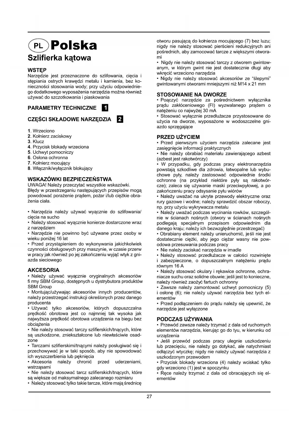 - Po wyłączeniu narzędzia nigdy nie należy zatrzymywać wirujących elementów działając na nie z bocznie przyłożoną siłą Urządzenie jest podwójnie izolowane zgodnie z normą EN 50144; dlatego też nie jest koniecz- ne jego uziemienie.KONSERWACJA Przed rozpoczęciem prac konserwacyjnych silnika należy upewnić się, że urządzenie nie znajduje się pod prądem. Urządzenia SBM Group zostały zaprojektowane do dzia- łania przez dłuższy okres czasu przy minimalnym nakła- dzie pracy związanym z konserwacją. Zadowalające działanie zależy od odpowiedniego dbania o urządzenie oraz regularnego czyszczenia. Należy regularnie czyścić obudowę urządzenia miękką szmatką, najlepiej po każdym użyciu. Należy dopilno- wać, aby otwory wentylacyjne nie były zatkane przez pył i brud. W przypadku, gdy brud nie daje się usunąć, należy użyć miękkiej szmatki zwilżonej wodą z mydłem. Nie wolno używać rozpuszczalników takich jak benzy-na, alkohol, woda z amoniakiem itd. Rozpuszczalniki te mogą uszkodzić części wykonane z plastiku. Urządzenie nie wymaga dodatkowego smarowania. W przypadku pojawienia się usterki, np. zużycia części, należy skontaktować się z najbliższym sprzedawcą SBM Group. ŚRODOWISKOW celu zabezpieczenia urządzenia przed uszkodzeniami w czasie transportu, jest ono dostarczane w odpowied- nio mocnym opakowaniu. Większość materiałów można poddać ponownej utylizacji. Należy umieścić materiały w odpowiednich dla ich właściwości pojemnikach uty- lizacyjnych. Nie używany jużsprzęt można odnieść do miejscowego sprzedawcy SBM Group. Zostanie on od-powiednio zutylizowany w sposób bezpieczny dla śro-dowiska.29