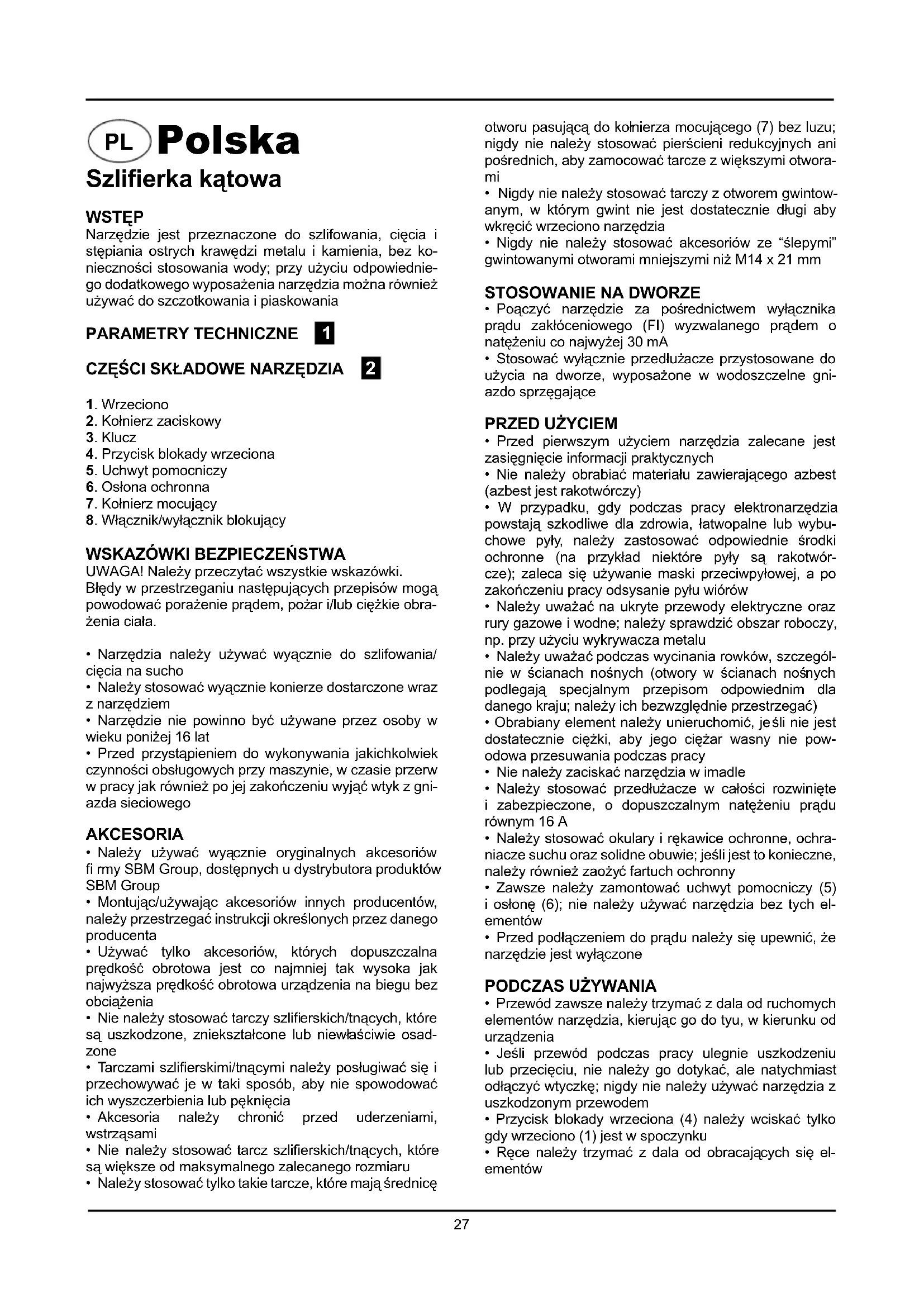 - Po wyłączeniu narzędzia nigdy nie należy zatrzymywać wirujących elementów działając na nie z bocznie przyłożoną siłą Urządzenie jest podwójnie izolowane zgodnie z normą EN 50144; dlatego też nie jest koniecz- ne jego uziemienie.KONSERWACJA Przed rozpoczęciem prac konserwacyjnych silnika należy upewnić się, że urządzenie nie znajduje się pod prądem. Urządzenia SBM Group zostały zaprojektowane do dzia- łania przez dłuższy okres czasu przy minimalnym nakła- dzie pracy związanym z konserwacją. Zadowalające działanie zależy od odpowiedniego dbania o urządzenie oraz regularnego czyszczenia. Należy regularnie czyścić obudowę urządzenia miękką szmatką, najlepiej po każdym użyciu. Należy dopilno- wać, aby otwory wentylacyjne nie były zatkane przez pył i brud. W przypadku, gdy brud nie daje się usunąć, należy użyć miękkiej szmatki zwilżonej wodą z mydłem. Nie wolno używać rozpuszczalników takich jak benzy-na, alkohol, woda z amoniakiem itd. Rozpuszczalniki te mogą uszkodzić części wykonane z plastiku. Urządzenie nie wymaga dodatkowego smarowania. W przypadku pojawienia się usterki, np. zużycia części, należy skontaktować się z najbliższym sprzedawcą SBM Group. ŚRODOWISKOW celu zabezpieczenia urządzenia przed uszkodzeniami w czasie transportu, jest ono dostarczane w odpowied- nio mocnym opakowaniu. Większość materiałów można poddać ponownej utylizacji. Należy umieścić materiały w odpowiednich dla ich właściwości pojemnikach uty- lizacyjnych. Nie używany jużsprzęt można odnieść do miejscowego sprzedawcy SBM Group. Zostanie on od-powiednio zutylizowany w sposób bezpieczny dla śro-dowiska.29