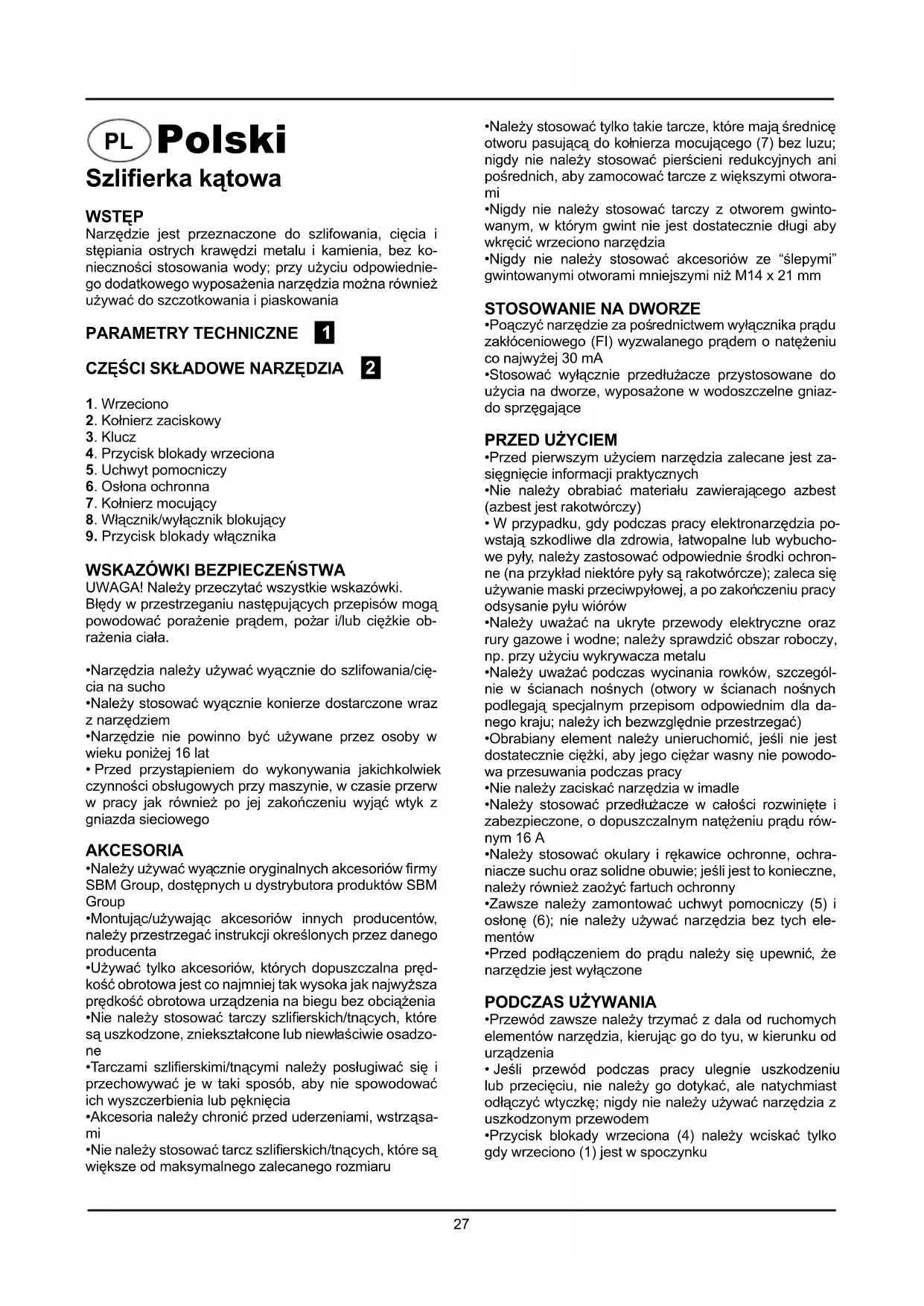 - Po wyłączeniu narzędzia nigdy nie należy zatrzymywać wirujących elementów działając na nie z bocznie przyło- żoną siłą Urządzenie jest podwójnie izolowane zgodnie z normą EN 60745; dlatego też nie jest ko- nieczne jego uziemienie.KONSERWACJA Przed rozpoczęciem prac konserwacyjnych silnika należy upewnić się, że urządzenie nie znajduje się pod prądem. Urządzenia SBM Group zostały zaprojektowane do dzia- łania przez dłuższy okres czasu przy minimalnym nakła- dzie pracy związanym z konserwacją. Zadowalające działanie zależy od odpowiedniego dbania o urządzenie oraz regularnego czyszczenia. Należy regularnie czyścić obudowę urządzenia miękką szmatką, najlepiej po każdym użyciu. Należy dopilno- wać, aby otwory wentylacyjne nie były zatkane przez pył i brud. W przypadku, gdy brud nie daje się usunąć, należy użyć miękkiej szmatki zwilżonej wodą z mydłem. Nie wolno używać rozpuszczalników takich jak benzy-na, alkohol, woda z amoniakiem itd. Rozpuszczalniki te mogą uszkodzić części wykonane z plastiku. Urządzenie nie wymaga dodatkowego smarowania. W przypadku pojawienia się usterki, np. zużycia części, należy skontaktować się z najbliższym sprzedawcą SBM Group. ŚRODOWISKOW celu zabezpieczenia urządzenia przed uszkodzeniami w czasie transportu, jest ono dostarczane w odpowied- nio mocnym opakowaniu. Większość materiałów można poddać ponownej utylizacji. Należy umieścić materiały w odpowiednich dla ich właściwości pojemnikach uty- lizacyjnych. Nie używany jużsprzęt można odnieść do miejscowego sprzedawcy SBM Group. Zostanie on od-powiednio zutylizowany w sposób bezpieczny dla śro-dowiska.29