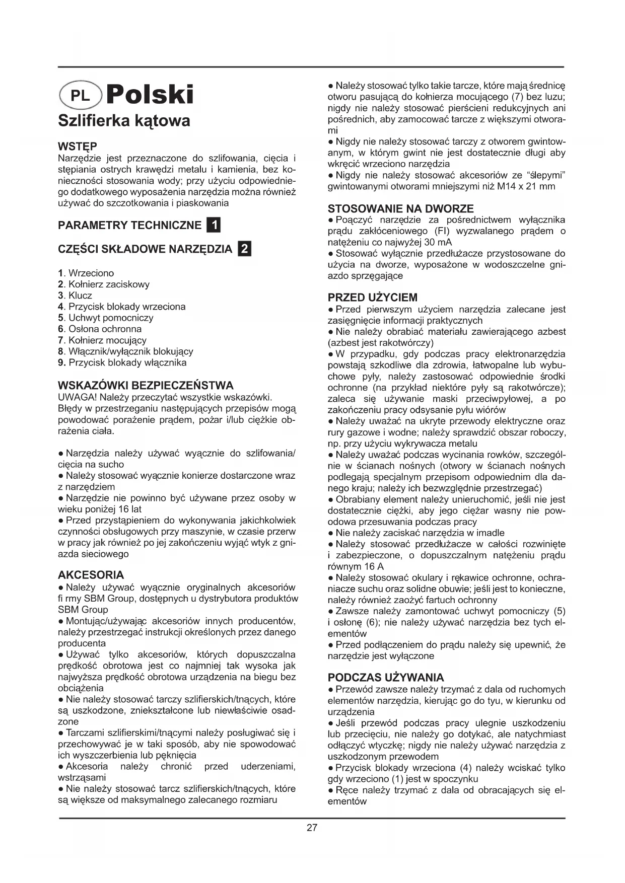 UWAGA! Należy przeczytać wszystkie wskazówki. Błędy w przestrzeganiu następujących przepisów mogą powodować porażenie prądem, pożar i/lub ciężkie ob- rażenia ciała. ● Narzędzia należy używać wyącznie do szlifowania/ cięcia na sucho ● Należy stosować wyącznie konierze dostarczone wraz z narzędziem ● Narzędzie nie powinno być używane przez osoby w wieku poniżej 16 lat ● Przed przystąpieniem do wykonywania jakichkolwiek czynności obsługowych przy maszynie, w czasie przerw w pracy jak również po jej zakończeniu wyjąć wtyk z gni- azda sieciowego AKCESORIA ● Należy używać wyącznie oryginalnych akcesoriów fi rmy SBM Group, dostępnych u dystrybutora produktów SBM Group ● Montując/używając akcesoriów innych producentów, należy przestrzegać instrukcji określonych przez danego producenta ● Używać tylko akcesoriów, których dopuszczalna prędkość obrotowa jest co najmniej tak wysoka jak najwyższa prędkość obrotowa urządzenia na biegu bez obciążenia ● Nie należy stosować tarczy szlifi erskich/tnących, które są uszkodzone, zniekształcone lub niewłaściwie osad- zone ● Tarczami szlifi erskimi/tnącymi należy posługiwać się i przechowywać je w taki sposób, aby nie spowodować ich wyszczerbienia lub pęknięcia ● Akcesoria należy chronić przed uderzeniami, wstrząsami ● Nie należy stosować tarcz szlifi erskich/tnących, które są większe od maksymalnego zalecanego rozmiaru ● Należy stosować tylko takie tarcze, które mają średnicę otworu pasującą do kołnierza mocującego (7) bez luzu; nigdy nie należy stosować pierścieni redukcyjnych ani pośrednich, aby zamocować tarcze z większymi otwora-