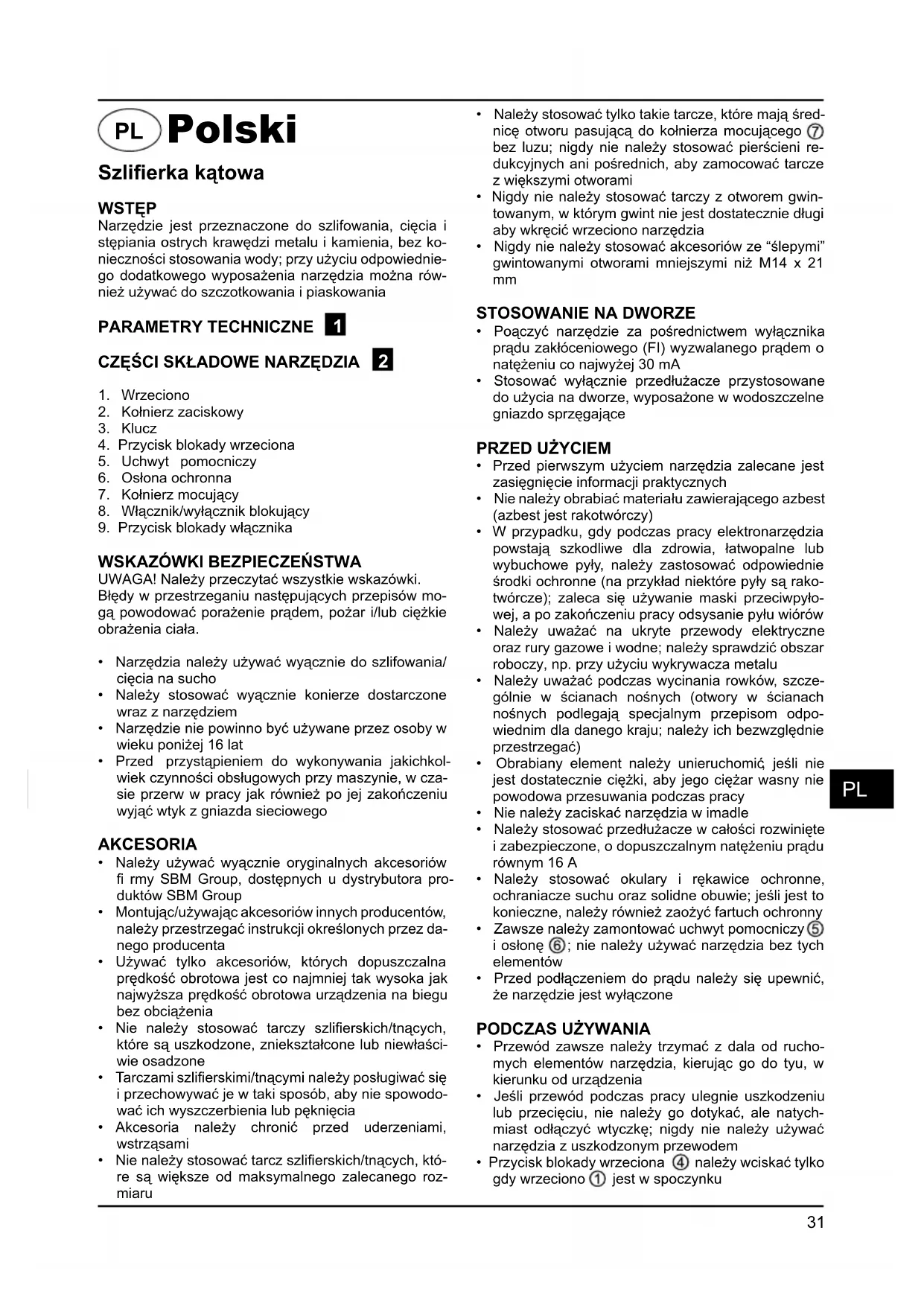 - Po wyłączeniu narzędzia nigdy nie należy zatrzymy- wać wirujących elementów działając na nie z bocz- nie przyłożoną siłąUrządzenie jest podwójnie izolowane zgodnie z normą EN 50144; dlatego też nie jest ko-nieczne jego uziemienie.KONSERWACJAPrzed rozpoczęciem prac konserwacyjnych silnika należy upewnić się, że urządzenie nie znajduje się pod prądem. Urządzenia SBM Group zostały zaprojektowane do działania przez dłuższy okres czasu przy minimalnym nakładzie pracy związanym z konserwacją. Zadowala- jące działanie zależy od odpowiedniego dbania o urzą- dzenie oraz regularnego czyszczenia. Należy regularnie czyścić obudowę urządzenia miękką szmatką, najlepiej po każdym użyciu. Należy dopilno- wać, aby otwory wentylacyjne nie były zatkane przez pył i brud. W przypadku, gdy brud nie daje się usunąć, należy użyć miękkiej szmatki zwilżonej wodą z mydłem. Nie wolno używać rozpuszczalników takich jak benzy-na, alkohol, woda z amoniakiem itd. Rozpuszczalniki te mogą uszkodzić części wykonane z plastiku.Urządzenie nie wymaga dodatkowego smarowania. W przypadku pojawienia się usterki, np. zużycia czę- ści, należy skontaktować się z najbliższym sprzedawcą SBM Group. ŚRODOWISKOW celu zabezpieczenia urządzenia przed uszkodzenia-mi w czasie transportu, jest ono dostarczane w odpo- wiednio mocnym opakowaniu. Większość materiałów można poddać ponownej utylizacji. Należy umieścić materiały w odpowiednich dla ich właściwości pojem- nikach utylizacyjnych. Nie używany jużsprzęt można odnieść do miejscowego sprzedawcy SBM Group. Zostanie on odpowiednio zutylizowany w sposób bez-pieczny dla środowiska. Úhlová bruska ÚVOD Tento nástroj je určen k broušení, řezání a odstraňová- ní otřepů kovových a kamenných materiálů bez použití vody; s vhodným příslušenstvím lze nástroj použít také k očisťování a pískováníTECHNICKÉ ÚDAJE 1 PRVKY PŘÍSTROJE 2 1. Vřeteno2. Upínací příruba3. Maticový klíče