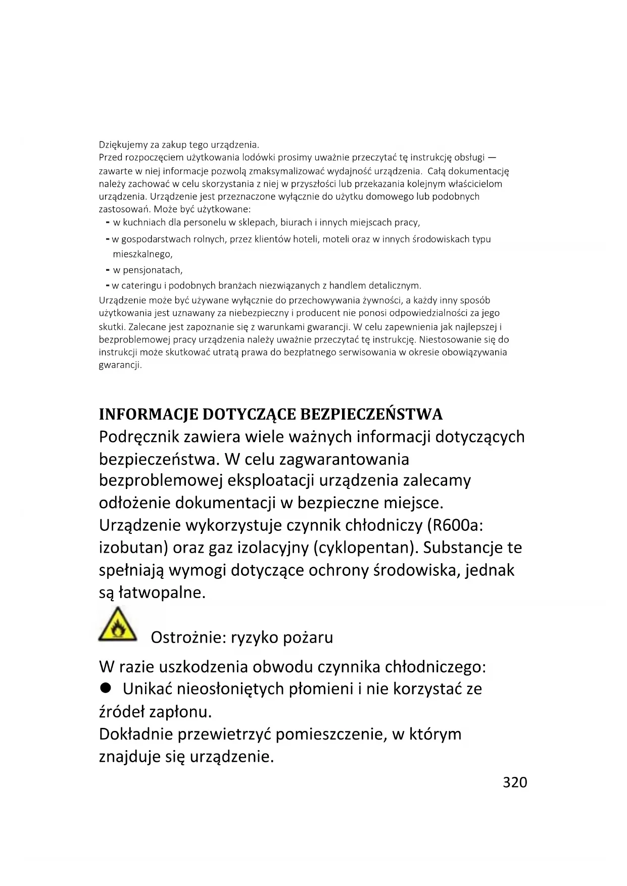 Dziękujemy za zakup tego urządzenia. Przed rozpoczęciem użytkowania lodówki prosimy uważnie przeczytać tę instrukcję obsługi — zawarte w niej informacje pozwolą zmaksymalizować wydajność urządzenia. Całą dokumentację należy zachować w celu skorzystania z niej w przyszłości lub przekazania kolejnym właścicielom urządzenia. Urządzenie jest przeznaczone wyłącznie do użytku domowego lub podobnych zastosowań. Może być użytkowane: - w kuchniach dla personelu w sklepach, biurach i innych miejscach pracy, - w gospodarstwach rolnych, przez klientów hoteli, moteli oraz w innych środowiskach typu mieszkalnego, - w pensjonatach, - w cateringu i podobnych branżach niezwiązanych z handlem detalicznym. Urządzenie może być używane wyłącznie do przechowywania żywności, a każdy inny sposób użytkowania jest uznawany za niebezpieczny i producent nie ponosi odpowiedzialności za jego skutki. Zalecane jest zapoznanie się z warunkami gwarancji. W celu zapewnienia jak najlepszej i bezproblemowej pracy urządzenia należy uważnie przeczytać tę instrukcję. Niestosowanie się do instrukcji może skutkować utratą prawa do bezpłatnego serwisowania w okresie obowiązywania gwarancji.