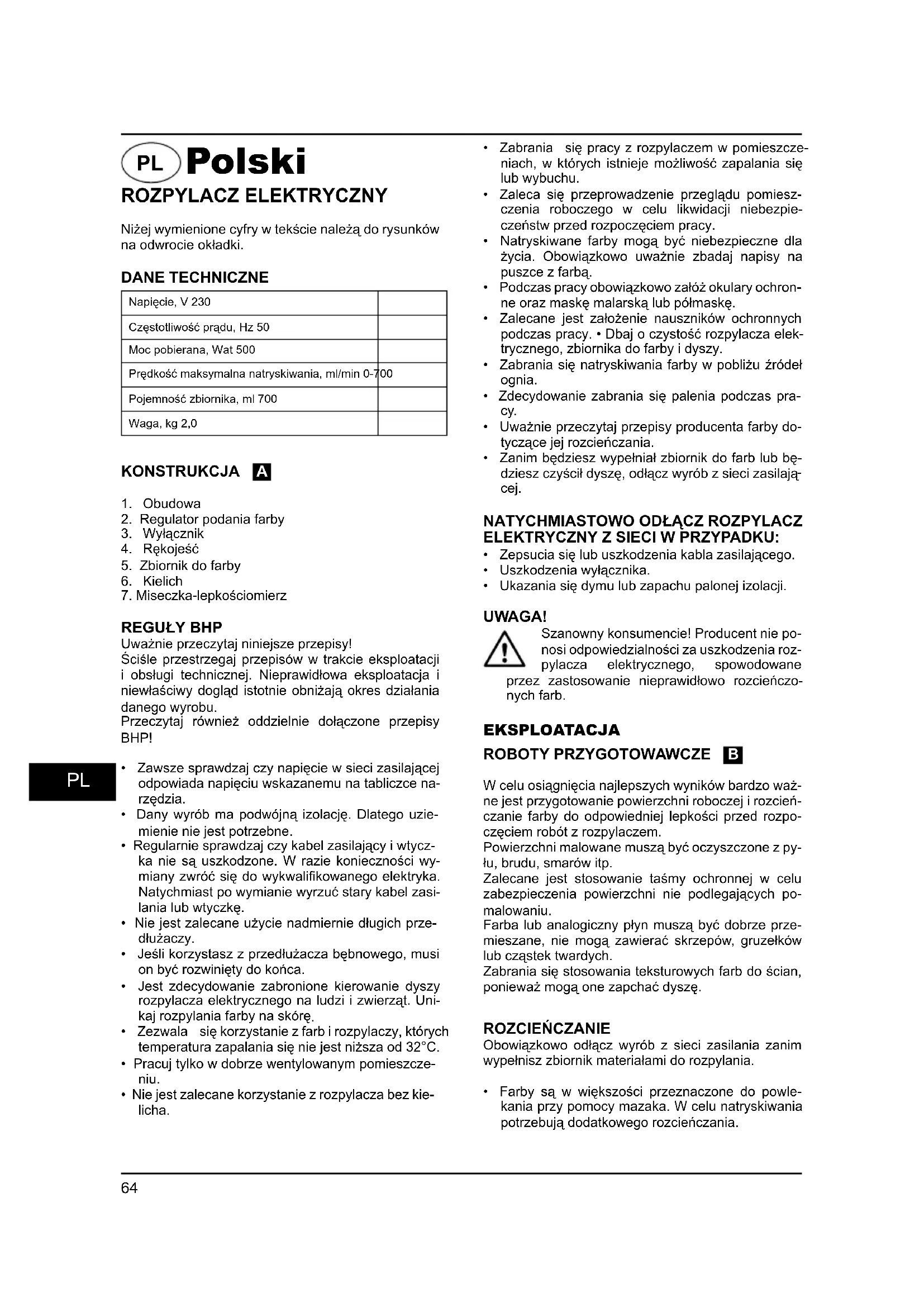 ROZPYLACZ ELEKTRYCZNY Niżej wymienione cyfry w tekście należą do rysunków na odwrocie okładki. DANE TECHNICZNE Napięcie, V 230Częstotliwość prądu, Hz 50Moc pobierana, Wat 500Prędkość maksymalna natryskiwania, ml/min 0-700Pojemność zbiornika, ml 700Waga, kg 2,0 KONSTRUKCJA A