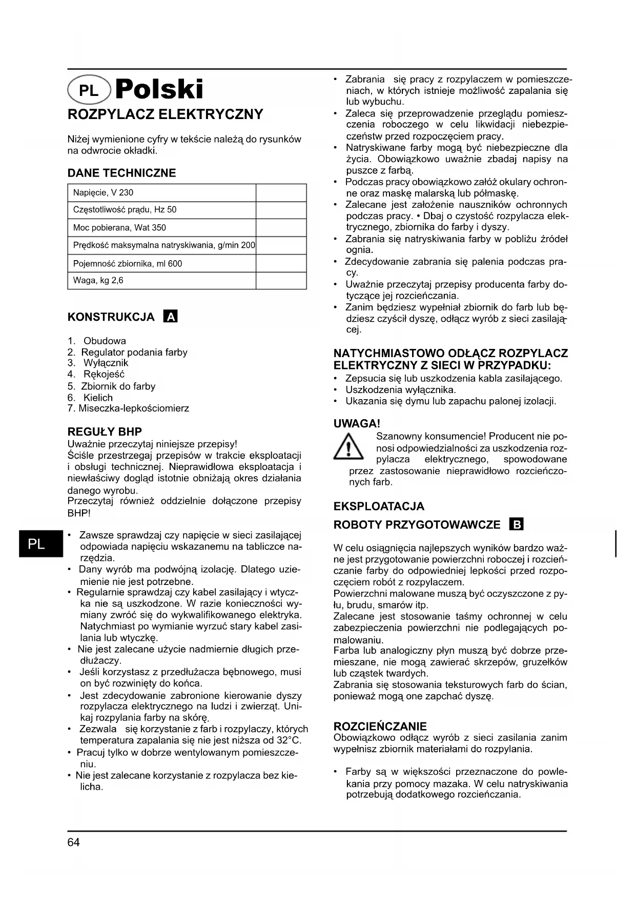 - Ukazania się dymu lub zapachu palonej izolacji. UWAGA! Szanowny konsumencie! Producent nie po- nosi odpowiedzialności za uszkodzenia roz- pylacza elektrycznego, spowodowane przez zastosowanie nieprawidłowo rozcieńczo- nych farb. EKSPLOATACJA ROBOTY PRZYGOTOWAWCZE