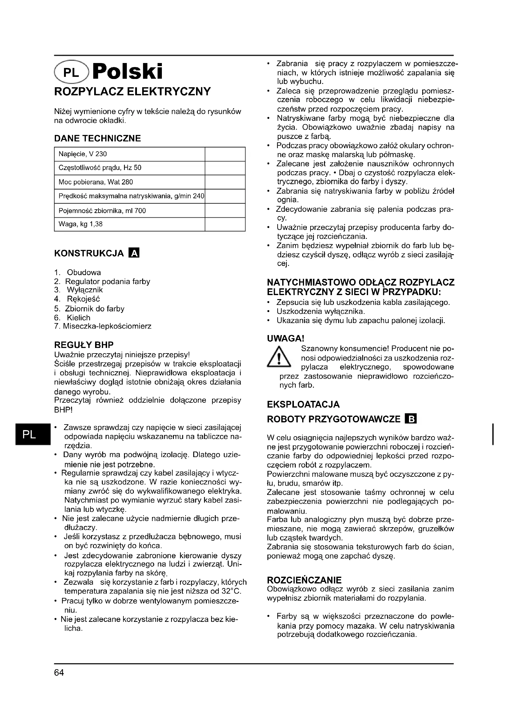 ROZPYLACZ ELEKTRYCZNY Niżej wymienione cyfry w tekście należą do rysunków na odwrocie okładki. DANE TECHNICZNE Napięcie, V 230Częstotliwość prądu, Hz 50Moc pobierana, Wat 280Prędkość maksymalna natryskiwania, g/min 240Pojemność zbiornika, ml 700 Waga, kg 1,38 KONSTRUKCJA A