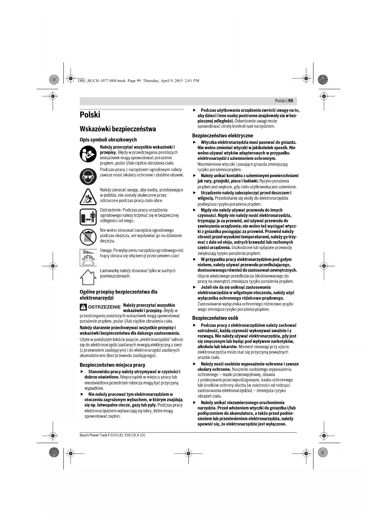 Denizli Tel.: 0258 2620666 Bulut Elektrik İstasyon Cad. No: 52/B Devlet Tiyatrosu Karşısı Elazığ Tel.: 0424 2183559 Körfez Elektrik Sanayi Çarşısı 770 Sok. No: 71 Erzincan Tel.: 0446 2230959 Ege Elektrik İnönü Bulvaro No: 135 Muğla Makasarası Fethiye Fethiye Tel.: 0252 6145701 Değer İş Bobinaj İsmetpaşa Mah. İlk Belediye Başkan Cad. 5/C Şahinbey Gaziantep Tel.: 0342 2316432 Çözüm Bobinaj İsmetpaşa Mah. Eski Şahinbey Belediyesi altı Cad. No: 3/C Gaziantep Tel.: 0342 2319500 Onarım Bobinaj Raifpaşa Cad. No: 67 İskenderun Hatay Tel.: 0326 6137546 Günşah Otomotiv Beylikdüzü Sanayi Sit. No: 210 Beylikdüzü İstanbul Tel.: 0212 8720066 Aygem 10021 Sok. No: 11 AOSB Çiğli İzmir Tel.: 0232 3768074 Sezmen Bobinaj Ege İş Merkezi 1201/4 Sok. No: 4/B Yenişehir İzmir Tel.: 0232 4571465 Ankaralı Elektrik Eski Sanayi Bölgesi 3. Cad. No: 43 Kayseri Tel.: 0352 3364216 Asal Bobinaj Eski Sanayi Sitesi Barbaros Cad. No: 24 Samsun Tel.: 0362 2289090 Üstündağ Elektrikli Aletler Nusretiye Mah. Boyacılar Aralığı No: 9 Tekirdağ Tel.: 0282 6512884 Nakliye Alet içindeki lityum iyon (Li-Ion) aküler tehlikeli madde taşıma yönetmeliği hükümlerine tabidir. Aküler başka bir yükümlülük olmaksızın kullanıcı tarafından caddeler üzerinde taşınabilir. Üçüncü kişiler eliyle yollanma durumunda (örneğin hava yolu ile veya nakliye şirketleri ile) paketleme ve etiketlemeye ilişkin özel hükümlere uyulmalıdır. Bu nedenle gönderi paketlenirken bir tehlikeli madde uzmanından yardım alınmalıdır. Tasfiye Bahçe aletleri, aksesuar ve ambalaj malzemesi çevre dostu bir biçimde tasfiye edilmek üzere geri dönüşüm merkezine yollanmak zorundadır. Bahçe aletlerini, şarj cihazlarını ve aküleri/bataryaları evsel çöplerin içine atmayın! Sadece AB üyesi ülkeler için: 2012/19/EU yönetmeliği uyarınca kullanım ömrünü tamamlamış elektronik ve elektrikli aletler ve 2006/66/EC yönetmeliği uyarınca arızalı veya kullanım ömrünü tamamlamış aküler/bataryalar ayrı ayrı toplanmak ve çevre dostu tasfiye için geri kazanım merkezlerine gönderilmek zorundadır. Alete entegre aküler sadece tasfiye amacıyla çıkarılabilirler. Gövdenin açılmasıyla bahçe aleti tahrip edilebilir. Aküyü elektrikli el aletinden çıkarmak için açma/kapama şalterine akü tam olarak boşalıncaya kadar basın. Gövdedeki vidaları sökün ve aküyü almak için gövde parçasını çıkarın. Kısa devreye neden olmamak için aküdeki bağlantıları teker teker ayırın ve kutupları izole edin. Tam olarak boşalma durumunda bile aküde kısa devreye neden olabilecek artık kapasite bulunur. Aküler/Bataryalar: Li-Ion: Lütfen “Nakliye” bölümündeki uyarı ve açıklamalara uyun. Değişiklik haklarımız saklıdır. OBJ_BUCH-1077-008.book Page 98 Thursday, April 9, 2015 2:01 PMPolski | 99 Bosch Power Tools F 016 L81 250 | (9.4.15) Polski Wskazówki bezpieczeństwa Opis symboli obrazkowych Należy przeczytać wszystkie wskazówki i przepisy. Błędy w przestrzeganiu poniższych wskazówek mogą spowodować porażenie prądem, pożar i/lub ciężkie obrażenia ciała. Podczas pracy z narzędziem ogrodowym należy zawsze nosić okulary ochronne i stabilne obuwie. Należy zwracać uwagę, aby osoby, przebywające w pobliżu, nie zostały skaleczone przez odrzucone podczas pracy ciała obce. Ostrzeżenie: Podczas pracy urządzenia ogrodowego należy trzymać się w bezpiecznej odległości od niego. Nie wolno stosować narzędzia ogrodowego podczas deszczu, ani wystawiać go na działanie deszczu. Uwaga: Po wyłączeniu narzędzia ogrodowego nóż tnący obraca się siłą inercji przez pewien czas! Ładowarkę należy stosować tylko w suchych pomieszczeniach. Ogólne przepisy bezpieczeństwa dla elektronarzędzi Należy przeczytać wszystkie wskazówki i przepisy. Błędy w przestrzeganiu poniższych wskazówek mogą spowodować porażenie prądem, pożar i/lub ciężkie obrażenia ciała. Należy starannie przechowywać wszystkie przepisy i wskazówki bezpieczeństwa dla dalszego zastosowania. Użyte w poniższym tekście pojęcie „elektronarzędzie“ odnosi się do elektronarzędzi zasilanych energią elektryczną z sieci (z przewodem zasilającym) i do elektronarzędzi zasilanych akumulatorami (bez przewodu zasilającego). Bezpieczeństwo miejsca pracy Stanowisko pracy należy utrzymywać w czystości i dobrze oświetlone. Nieporządek w miejscu pracy lub nieoświetlona przestrzeń robocza mogą być przyczyną wypadków. Nie należy pracować tym elektronarzędziem w otoczeniu zagrożonym wybuchem, w którym znajdują się np. łatwopalne ciecze, gazy lub pyły. Podczas pracy elektronarzędziem wytwarzają się iskry, które mogą spowodować zapłon. Podczas użytkowania urządzenia zwrócić uwagę na to, aby dzieci i inne osoby postronne znajdowały się w bez- piecznej odległości. Odwrócenie uwagi może spowodować utratę kontroli nad narzędziem. Bezpieczeństwo elektryczne Wtyczka elektronarzędzia musi pasować do gniazda. Nie wolno zmieniać wtyczki w jakikolwiek sposób. Nie wolno używać wtyków adapterowych w przypadku elektronarzędzi z uziemieniem ochronnym. Niezmienione wtyczki i pasujące gniazda zmniejszają ryzyko porażenia prądem. Należy unikać kontaktu z uziemionymi powierzchniami jak rury, grzejniki, piece i lodówki. Ryzyko porażenia prądem jest większe, gdy ciało użytkownika jest uziemione. Urządzenie należy zabezpieczyć przed deszczem i wilgocią. Przedostanie się wody do elektronarzędzia podwyższa ryzyko porażenia prądem. Nigdy nie należy używać przewodu do innych czynności. Nigdy nie należy nosić elektronarzędzia, trzymając je za przewód, ani używać przewodu do zawieszenia urządzenia; nie wolno też wyciągać wtycz- ki z gniazdka pociągając za przewód. Przewód należy chronić przed wysokimi temperaturami, należy go trzy- mać z dala od oleju, ostrych kraw