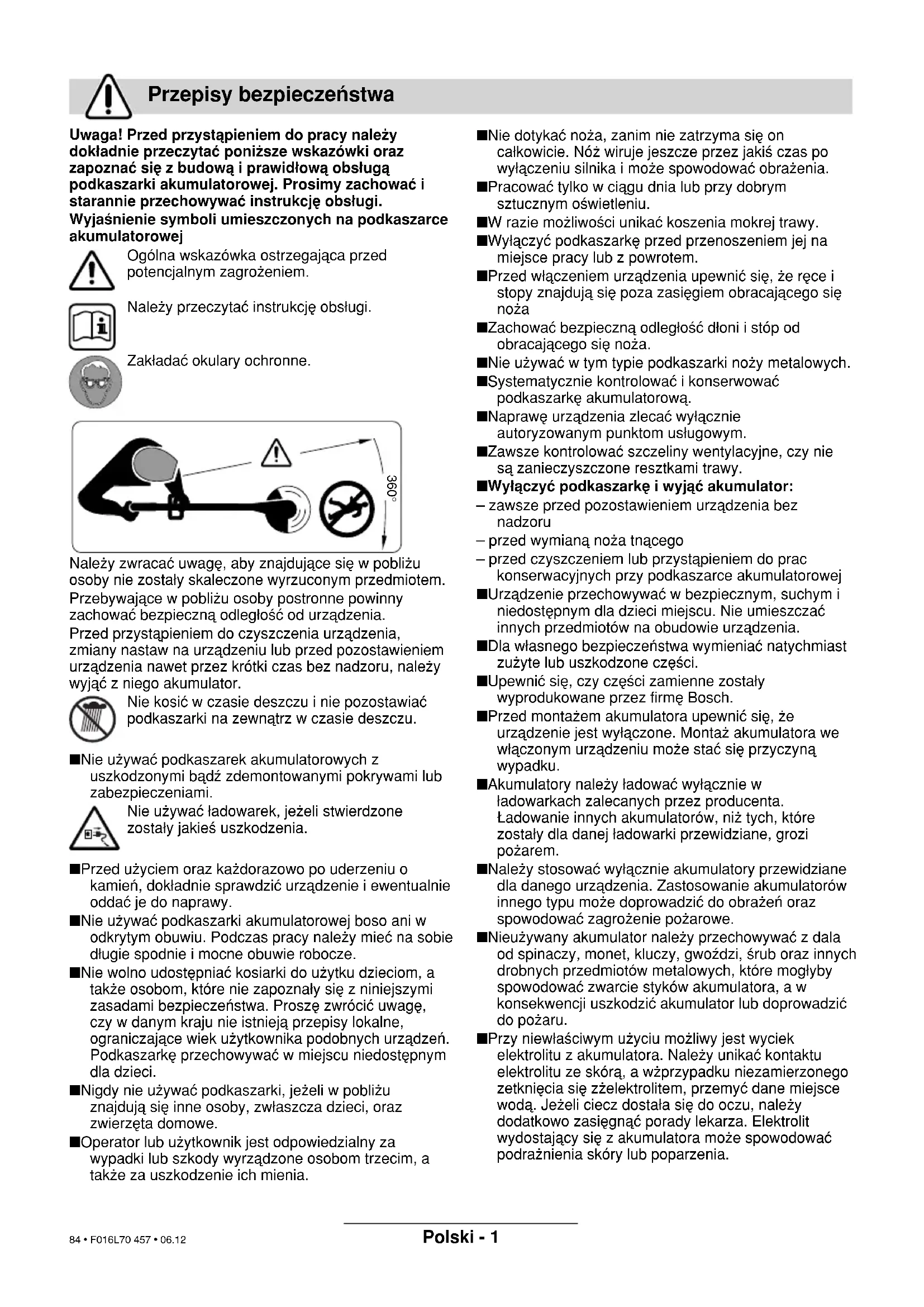 Deπiµiklikler mümkündür Tasfiye (atma) Müµteri servisi Uygunluk beyan∂ F016L70 457.book Seite 6 Montag, 18. Dezember 2006 9:45 09 83 • F016L70 457 • 06.12Polski - 1 Uwaga! Przed przyståpieniem do pracy nale†y dok∆adnie przeczytaç poni†sze wskazøwki oraz zapoznaç si∑ z budowå i prawid∆owå obs∆ugå podkaszarki akumulatorowej. Prosimy zachowaç i starannie przechowywaç instrukcj∑ obs∆ugi. Wyja∂nienie symboli umieszczonych na podkaszarce akumulatorowej Ogølna wskazøwka ostrzegajåca przed potencjalnym zagro†eniem. Nale†y przeczytaç instrukcj∑ obs∆ugi. Zak∆adaç okulary ochronne. Nale†y zwracaç uwag∑, aby znajdujåce si∑ w pobli†u osoby nie zosta∆y skaleczone wyrzuconym przedmiotem. Przebywajåce w pobli†u osoby postronne powinny zachowaç bezpiecznå odleg∆o∂ç od urzådzenia. Przed przyståpieniem do czyszczenia urzådzenia, zmiany nastaw na urzådzeniu lub przed pozostawieniem urzådzenia nawet przez krøtki czas bez nadzoru, nale†y wyjåç z niego akumulator. Nie kosiç w czasie deszczu i nie pozostawiaç podkaszarki na zewnåtrz w czasie deszczu. ■ Nie u†ywaç podkaszarek akumulatorowych z uszkodzonymi bådΩ zdemontowanymi pokrywami lub zabezpieczeniami. Nie u†ywaç ∆adowarek, je†eli stwierdzone zosta∆y jakie∂ uszkodzenia. ■ Przed u†yciem oraz ka†dorazowo po uderzeniu o kamieµ, dok∆adnie sprawdziç urzådzenie i ewentualnie oddaç je do naprawy. ■ Nie u†ywaç podkaszarki akumulatorowej boso ani w odkrytym obuwiu. Podczas pracy nale†y mieç na sobie d∆ugie spodnie i mocne obuwie robocze. ■ Nie wolno udost∑pniaç kosiarki do u†ytku dzieciom, a tak†e osobom, ktøre nie zapozna∆y si∑ z niniejszymi zasadami bezpieczeµstwa. Prosz∑ zwrøciç uwag∑, czy w danym kraju nie istniejå przepisy lokalne, ograniczajåce wiek u†ytkownika podobnych urzådzeµ. Podkaszark∑ przechowywaç w miejscu niedost∑pnym dla dzieci. ■ Nigdy nie u†ywaç podkaszarki, je†eli w pobli†u znajdujå si∑ inne osoby, zw∆aszcza dzieci, oraz zwierz∑ta domowe. ■ Operator lub u†ytkownik jest odpowiedzialny za wypadki lub szkody wyrzådzone osobom trzecim, a tak†e za uszkodzenie ich mienia. ■ Nie dotykaç no†a, zanim nie zatrzyma si∑ on ca∆kowicie. Nø† wiruje jeszcze przez jaki∂ czas po wy∆åczeniu silnika i mo†e spowodowaç obra†enia. ■ Pracowaç tylko w ciågu dnia lub przy dobrym sztucznym o∂wietleniu. ■ W razie mo†liwo∂ci unikaç koszenia mokrej trawy. ■ Wy∆åczyç podkaszark∑ przed przenoszeniem jej na miejsce pracy lub z powrotem. ■ Przed w∆åczeniem urzådzenia upewniç si∑, †e r∑ce i stopy znajdujå si∑ poza zasi∑giem obracajåcego si∑ no†a ■ Zachowaç bezpiecznå odleg∆o∂ç d∆oni i støp od obracajåcego si∑ no†a. ■ Nie u†ywaç w tym typie podkaszarki no†y metalowych. ■ Systematycznie kontrolowaç i konserwowaç podkaszark∑ akumulatorowå. ■ Napraw∑ urzådzenia zlecaç wy∆åcznie autoryzowanym punktom us∆ugowym. ■ Zawsze kontrolowaç szczeliny wentylacyjne, czy nie så zanieczyszczone resztkami trawy. ■ Wy∆åczyç podkaszark∑ i wyjåç akumulator: – zawsze przed pozostawieniem urzådzenia bez nadzoru – przed wymianå no†a tnåcego – przed czyszczeniem lub przyståpieniem do prac konserwacyjnych przy podkaszarce akumulatorowej ■ Urzådzenie przechowywaç w bezpiecznym, suchym i niedost∑pnym dla dzieci miejscu. Nie umieszczaç innych przedmiotøw na obudowie urzådzenia. ■ Dla w∆asnego bezpieczeµstwa wymieniaç natychmiast zu†yte lub uszkodzone cz∑∂ci. ■ Upewniç si∑, czy cz∑∂ci zamienne zosta∆y wyprodukowane przez firm∑ Bosch. ■ Przed monta†em akumulatora upewniç si∑, †e urzådzenie jest wy∆åczone. Monta† akumulatora we w∆åczonym urzådzeniu mo†e staç si∑ przyczynå wypadku. ■ Akumulatory nale†y ∆adowaç wy∆åcznie w ∆adowarkach zalecanych przez producenta. ˆadowanie innych akumulatorøw, ni† tych, ktøre zosta∆y dla danej ∆adowarki przewidziane, grozi po†arem. ■ Nale†y stosowaç wy∆åcznie akumulatory przewidziane dla danego urzådzenia. Zastosowanie akumulatorøw innego typu mo†e doprowadziç do obra†eµ oraz spowodowaç zagro†enie po†arowe. ■ Nieu†ywany akumulator nale†y przechowywaç z dala od spinaczy, monet, kluczy, gwoΩdzi, ∂rub oraz innych drobnych przedmiotøw metalowych, ktøre mog∆yby spowodowaç zwarcie stykøw akumulatora, a w konsekwencji uszkodziç akumulator lub doprowadziç do po†aru. ■ Przy niew∆a∂ciwym u†yciu mo†liwy jest wyciek elektrolitu z akumulatora. Nale†y unikaç kontaktu elektrolitu ze skørå, a w†przypadku niezamierzonego zetkni∑cia si∑ z†elektrolitem, przemyç dane miejsce wodå. Je†eli ciecz dosta∆a si∑ do oczu, nale†y dodatkowo zasi∑gnåç porady lekarza. Elektrolit wydostajåcy si∑ z akumulatora mo†e spowodowaç podra†nienia skøry lub poparzenia. Przepisy bezpieczeµstwa 360° F016L70 457.book Seite 1 Montag, 18. Dezember 2006 9:45 09 84 • F016L70 457 • 06.12Polski - 2 Urzådzenie przeznaczone jest do ∂cinania trawy oraz chwastøw, rosnåcych pod krzewami, przy krzewach i na kraw∑dziach trawnika, ktørych nie daje si∑ skosiç kosiarkå. Prawid∆owa eksploatacja urzådzenia powinna odbywaç si∑ w temperaturze otoczenia od 0 °C do 40 °C. Niniejsza instrukcja zawiera wskazøwki dotyczåce prawid∆owego monta†u oraz bezpiecznego u†ytkowania urzådzenia. Nale†y dok∆adnie zapoznaç si∑ z jej tre∂ciå. Urzådzenie nale†y ostro†nie wyjåç z opakowania i†upewniç si∑, czy w opakowaniu znajdujå si∑ nast∑pujåce elementy: – Podkaszarka – Pokrywa ochronna – Talerz tnåcy – No†e tnåce – ˆadowarka – Instrukcja obs∆ugi W przypadku stwierdzenia braku lub uszkodzenia ktørego∂ z elementøw, nale†y skontaktowaç si∑ ze sklepem, w ktørym dokonali Paµstwo zakupu. 1 W∆åczni