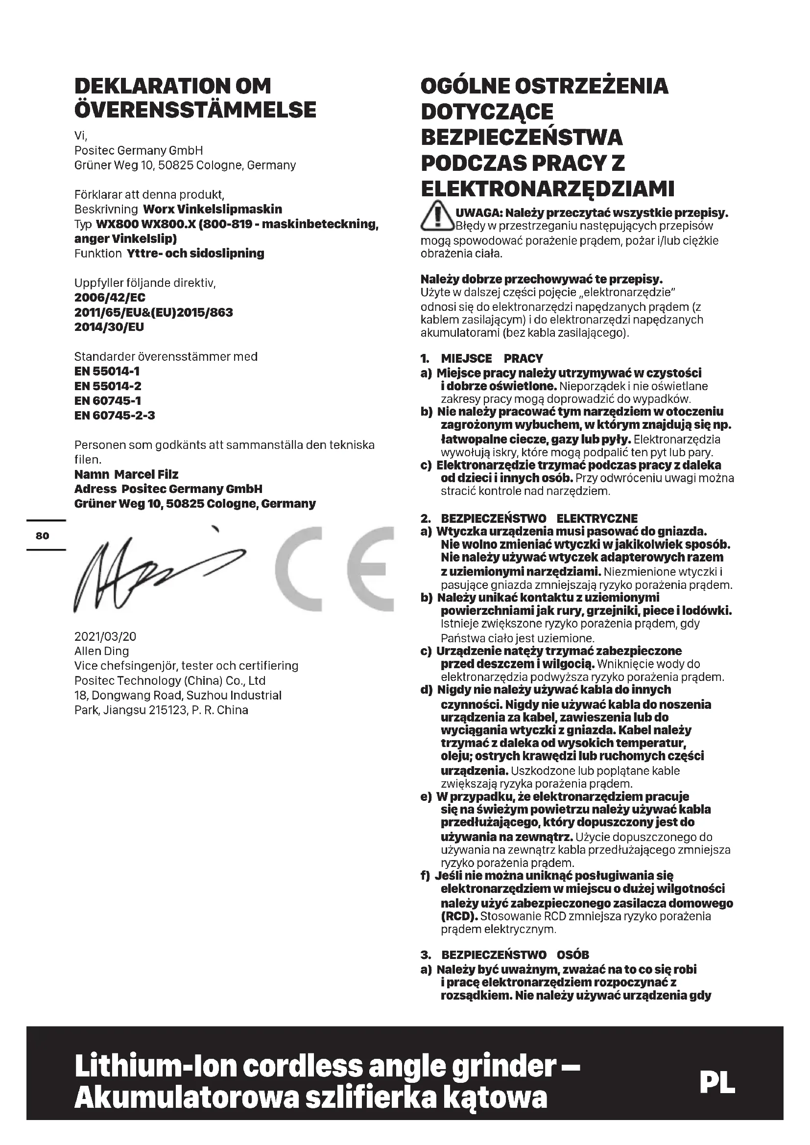We, Positec Germany GmbH Grüner Weg 10, 50825 Cologne, Germany Deklarujemy, że produkt, Opis Szlifierka kątowa Worx Typ WX800 WX800.X (800-819 - oznaczenie urządzenia, reprezentuje Szlifierka kątowa) Funkcja Szlifowanie boczne i obwodowe Jest zgodny z następującymi dyrektywami: 2006/42/EC 2011/65/EU&(EU)2015/863 2014/30/EU Normy są zgodne z: EN 55014-1 EN 55014-2 EN 60745-1 EN 60745-2-3 Osoba upoważniona do kompilacji pliku technicznego, Nazwa Marcel Filz Adres Positec Germany GmbH Grüner Weg 10, 50825 Cologne, Germany 2021/03/20 Allen Ding Zastępca głównego inżyniera, testowanie i certyfikacja Positec Technology (China) Co., Ltd 18, Dongwang Road, Suzhou Industrial Park, Jiangsu 215123, P. R. China μ GR
