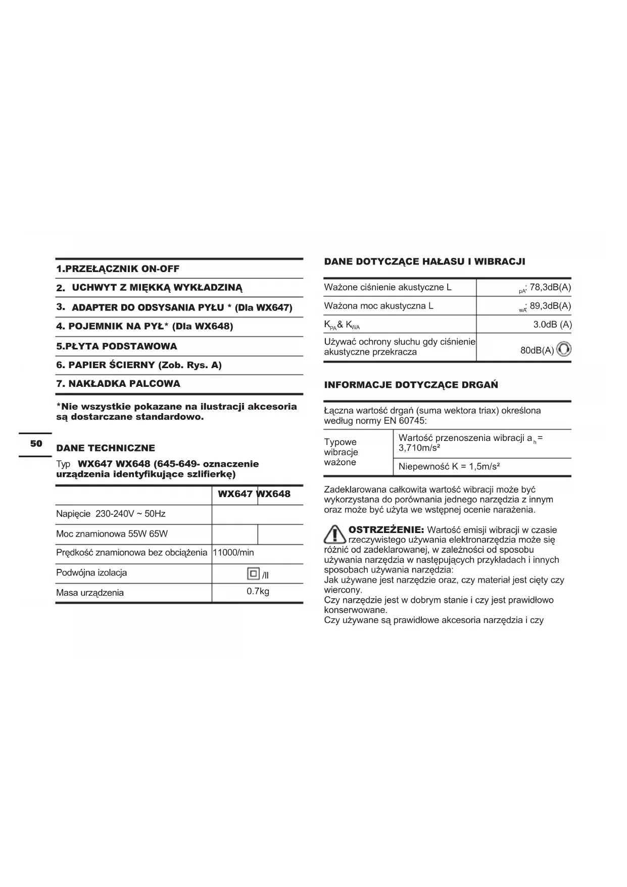 3,710m/s² Niepewność K = 1,5m/s² Zadeklarowana całkowita wartość wibracji może być wykorzystana do porównania jednego narzędzia z innym oraz może być użyta we wstępnej ocenie narażenia. OSTRZEŻENIE: Wartość emisji wibracji w czasie rzeczywistego używania elektronarzędzia może się różnić od zadeklarowanej, w zależności od sposobu używania narzędzia w następujących przykładach i innych sposobach używania narzędzia: Jak używane jest narzędzie oraz, czy materiał jest cięty czy wiercony. Czy narzędzie jest w dobrym stanie i czy jest prawidłowo konserwowane. Czy używane są prawidłowe akcesoria narzędzia i czy51 narzędzie jest właściwie naostrzone oraz w dobrym stanie. Czy dokręcone są szczęki na uchwycie i czy używane są jakiekolwiek akcesoria antybiracyjne. Oraz, czy narzędzie jest używane zgodnie z przeznaczeniem i według instrukcji. Niepawidłowe prowadzenie tego narzędzia może spowodować syndrom wibracji rąk. OSTRZEŻENIE:W szczególności, oszacowanie poziomu ekspozycji w rzeczywistych warunkach używania powinno brać także pod uwagę wszystkie elementy cyklu działania, takie jak czasy wyłączenia narzędzia i czas bezczynności, ale nie rzeczywiście wykonywaną pracę. Może to znacznie zmniejszyć poziom ekspozycji w całym okresie pracy. Pomoc w minimalizacji narażenia na wibracje. Narzędzie należy konserwować z godnie z instrukcjami i prawidłowo smarować (w odpowiednich miejscach) Jeśli narzędzie jest używane regularnie należy zakupić akcesoria antywibracyjne. Należy unikać używania narzędzi w temperaturach 10°C lub niższych Należy zaplanować harmonogram pracy w celu rozłożenia używania narzędzi wytwarzających wysoki poziom drgań na kilka dni. AKCESORIA WX647 WX648 Papier ścierny Velcro (perforowany) 6pc 9pc Papier ścierny do usuwania farby 3pc 6pc Palcowy arkusz ścierny 3pc 6pc Nakładka palcowa 1pc 1pc Adapter do odsysania pyłu 1pc / Pojemnik Na Pył / 1pc Zaleca się zakup wszystkich akcesoriów w sklepie, gdzie zakupiono narzędzie. Więcej szczegółów można znaleźć w dodatkowym opakowaniu. Personel sklepu może również udzielić pomocy i porad.