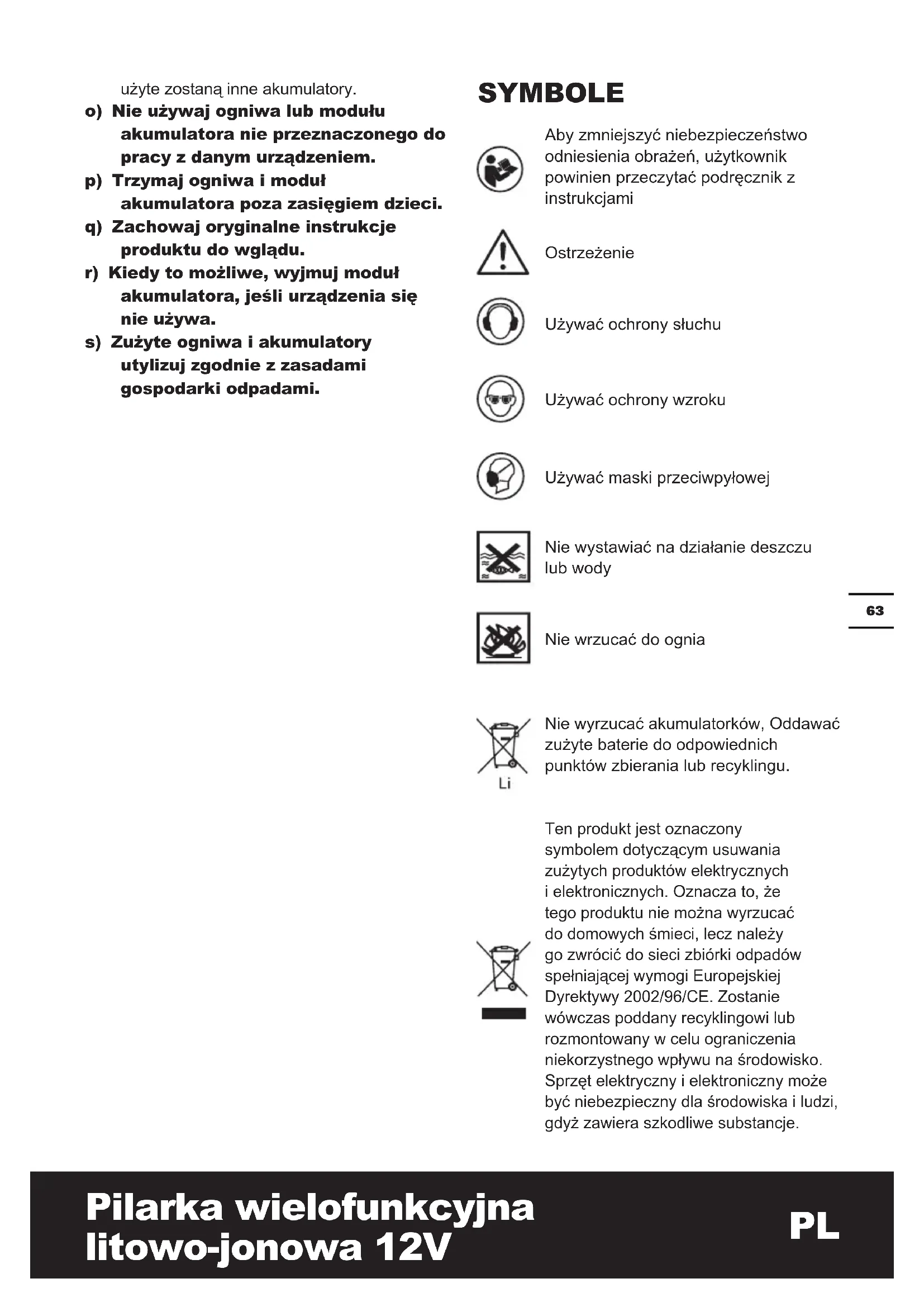 Aby zmniejszyć niebezpieczeństwo odniesienia obrażeń, użytkownik powinien przeczytać podręcznik z instrukcjami Ostrzeżenie Używać ochrony słuchu Używać ochrony wzroku Używać maski przeciwpyłowej Nie wystawiać na działanie deszczu lub wody Nie wrzucać do ognia Nie wyrzucać akumulatorków, Oddawać zużyte baterie do odpowiednich punktów zbierania lub recyklingu. Ten produkt jest oznaczony symbolem dotyczącym usuwania zużytych produktów elektrycznych i elektronicznych. Oznacza to, że tego produktu nie można wyrzucać do domowych śmieci, lecz należy go zwrócić do sieci zbiórki odpadów spełniającej wymogi Europejskiej Dyrektywy 2002/96/CE. Zostanie wówczas poddany recyklingowi lub rozmontowany w celu ograniczenia niekorzystnego wpływu na środowisko. Sprzęt elektryczny i elektroniczny może być niebezpieczny dla środowiska i ludzi, gdyż zawiera szkodliwe substancje.