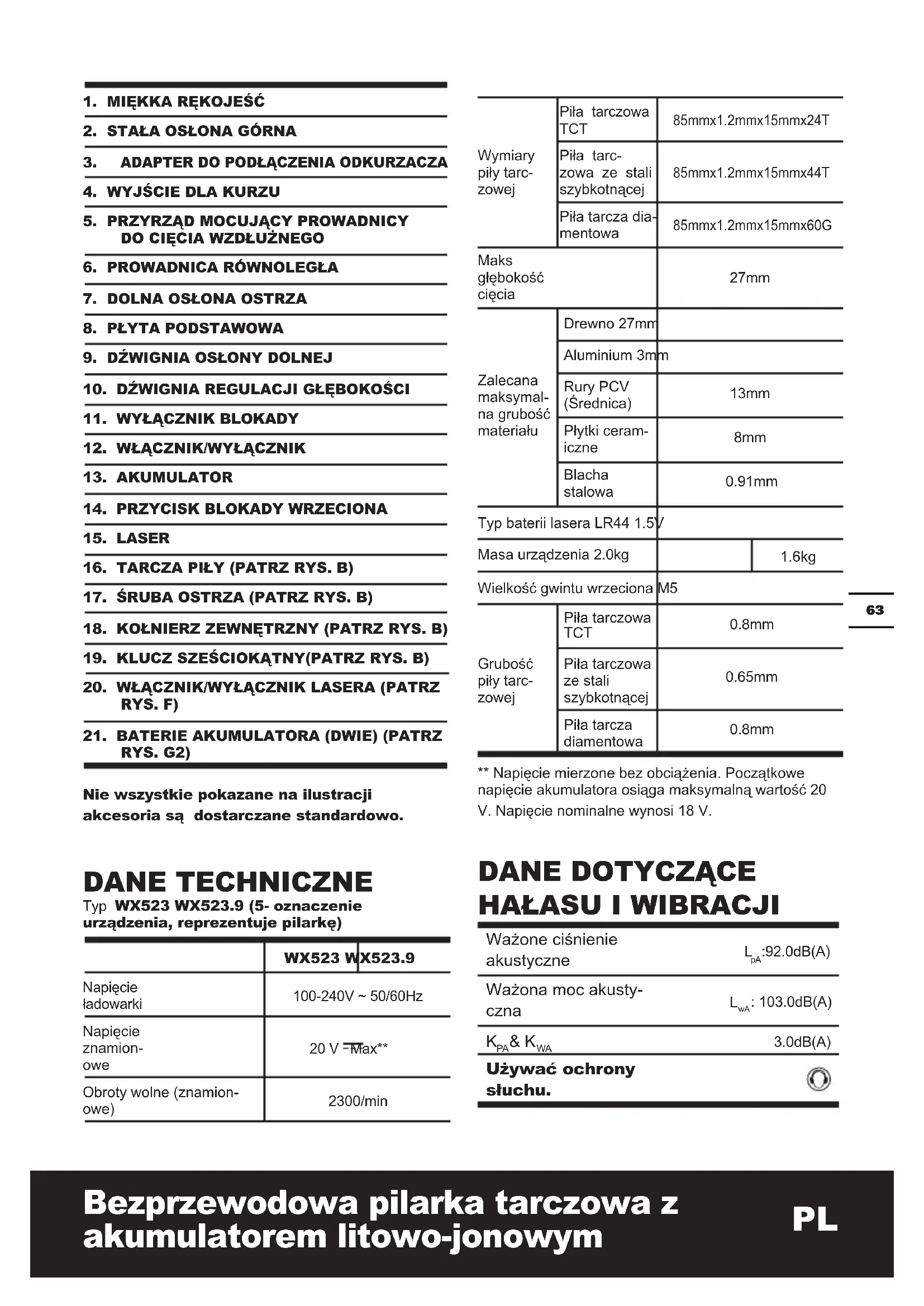 RYS. G2) Nie wszystkie pokazane na ilustracji akcesoria są dostarczane standardowo. DANE TECHNICZNE Typ WX523 WX523.9 (5- oznaczenie urządzenia, reprezentuje pilarkę) WX523 WX523.9 Napięcie ładowarki 100-240V ~ 50/60Hz Napięcie znamion- owe 20 V Max** Obroty wolne (znamion- owe) 2300/min Wymiary piły tarc- zowej Piła tarczowa TCT 85mmx1.2mmx15mmx24T Piła tarc- zowa ze stali szybkotnącej 85mmx1.2mmx15mmx44T Piła tarcza dia- mentowa 85mmx1.2mmx15mmx60G Maks głębokość cięcia 27mm Zalecana maksymal- na grubość materiału Drewno 27mm Aluminium 3mm Rury PCV (Średnica) 13mm Płytki ceram- iczne 8mm Blacha stalowa 0.91mm Typ baterii lasera LR44 1.5V Masa urządzenia 2.0kg 1.6kg Wielkość gwintu wrzeciona M5 Grubość piły tarc- zowej Piła tarczowa TCT 0.8mm Piła tarczowa ze stali szybkotnącej 0.65mm Piła tarcza diamentowa 0.8mm ** Napięcie mierzone bez obciążenia. Początkowe napięcie akumulatora osiąga maksymalną wartość 20