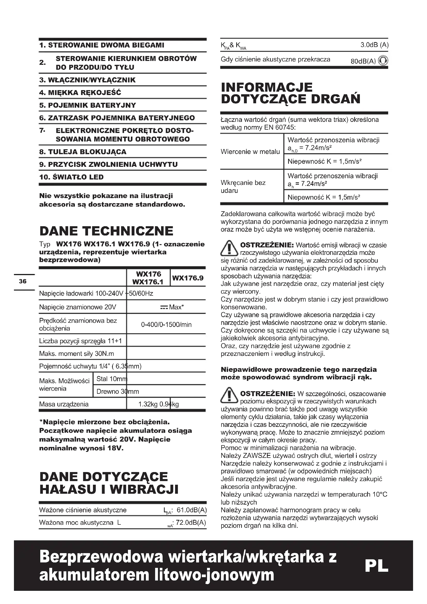 Nie wszystkie pokazane na ilustracji akcesoria są dostarczane standardowo. DANE TECHNICZNE Typ WX176 WX176.1 WX176.9 (1- oznaczenie urządzenia, reprezentuje wiertarka bezprzewodowa) WX176 WX176.1 WX176.9 Napięcie ładowarki 100-240V ~50/60Hz Napięcie znamionowe 20V Max* Prędkość znamionowa bez obciążenia 0-400/0-1500/min Liczba pozycji sprzęgła 11+1 Maks. moment siły 30N.m Pojemność uchwytu 1/4” ( 6.35mm) Maks. Możliwości wiercenia Stal 10mm Drewno 30mm Masa urządzenia 1.32kg 0.94kg *Napięcie mierzone bez obciążenia. Początkowe napięcie akumulatora osiąga maksymalną wartość 20V. Napięcie nominalne wynosi 18V.
