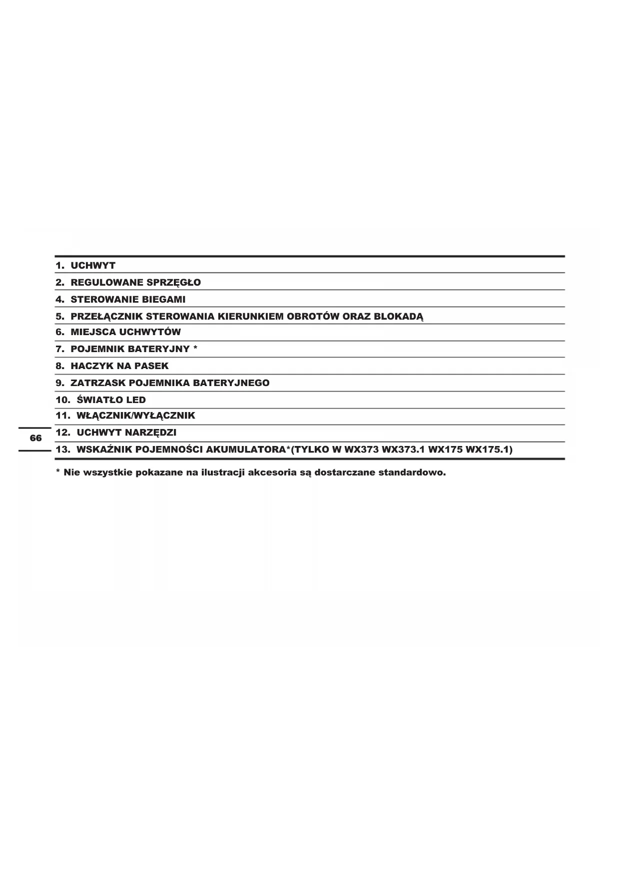 =8.43m/s² Niepewność K = 1.5m/s² Zadeklarowana całkowita wartość wibracji może być wykorzystana do porównania jednego narzędzia z innym oraz może być użyta we wstępnej ocenie narażenia. OSTRZEŻENIE: Wartość emisji wibracji w czasie rzeczywistego używania elektronarzędzia może się różnić od zadeklarowanej, w zależności od sposobu używania narzędzia w następujących przykładach i innych sposobach używania narzędzia: Jak używane jest narzędzie oraz, czy materiał jest cięty czy wiercony. Czy narzędzie jest w dobrym stanie i czy jest prawidłowo konserwowane. Czy używane są prawidłowe akcesoria narzędzia i czy narzędzie jest właściwie naostrzone oraz w dobrym stanie. Czy dokręcone są szczęki na uchwycie i czy używane są jakiekolwiek akcesoria antybiracyjne. Oraz, czy narzędzie jest używane zgodnie z przeznaczeniem i według instrukcji Niepawidłowe prowadzenie tego narzędzia może spowodować syndrom wibracji rąk. OSTRZEŻENIE: W szczególności, oszacowanie poziomu ekspozycji w rzeczywistych warunkach używania powinno brać także pod uwagę wszystkie elementy cyklu działania, takie jak czasy wyłączenia narzędzia i czas bezczynności, ale69 nie rzeczywiście wykonywaną pracę. Może to znacznie zmniejszyć poziom ekspozycji w całym okresie pracy. Pomoc w minimalizacji narażenia na wibracje. Narzędzie należy konserwować z godnie z instrukcjami i prawidłowo smarować (w odpowiednich miejscach) Jeśli narzędzie jest używane regularnie należy zakupić akcesoria antywibracyjne. Należy unikać używania narzędzi w temperaturach 10°C lub niższych Należy zaplanować harmonogram pracy w celu rozłożenia używania narzędzi wytwarzających wysoki poziom drgań na kilka dni. AKCESORIA WX175 WX175.1 WX175.2 WX175.9 WX373 WX373.1 WX373.2 WX373.9 Ładowarka 1 1 1 / 1 1 1 / Akumulator 2 1 2 / 2 1 2 / Końcówka Śrubokręta 1 1 1 1 1 1 1 1 Haczyk 1 1 1 1 1 1 1 1 Uchwyt narzędzi 1 1 1 1 1 1 1 1 Zaleca się zakup wszystkich akcesoriów w sklepie, gdzie zakupiono narzędzie. Używać dobrej jakości akcesoriów oznaczonych dobrze znanymi markami. Wybierać wiertła według rodzaju pracy, która ma być wykonana. Więcej szczegółów można znaleźć w dodatkowym opakowaniu. Personel sklepu może również udzielić pomocy i porad.70