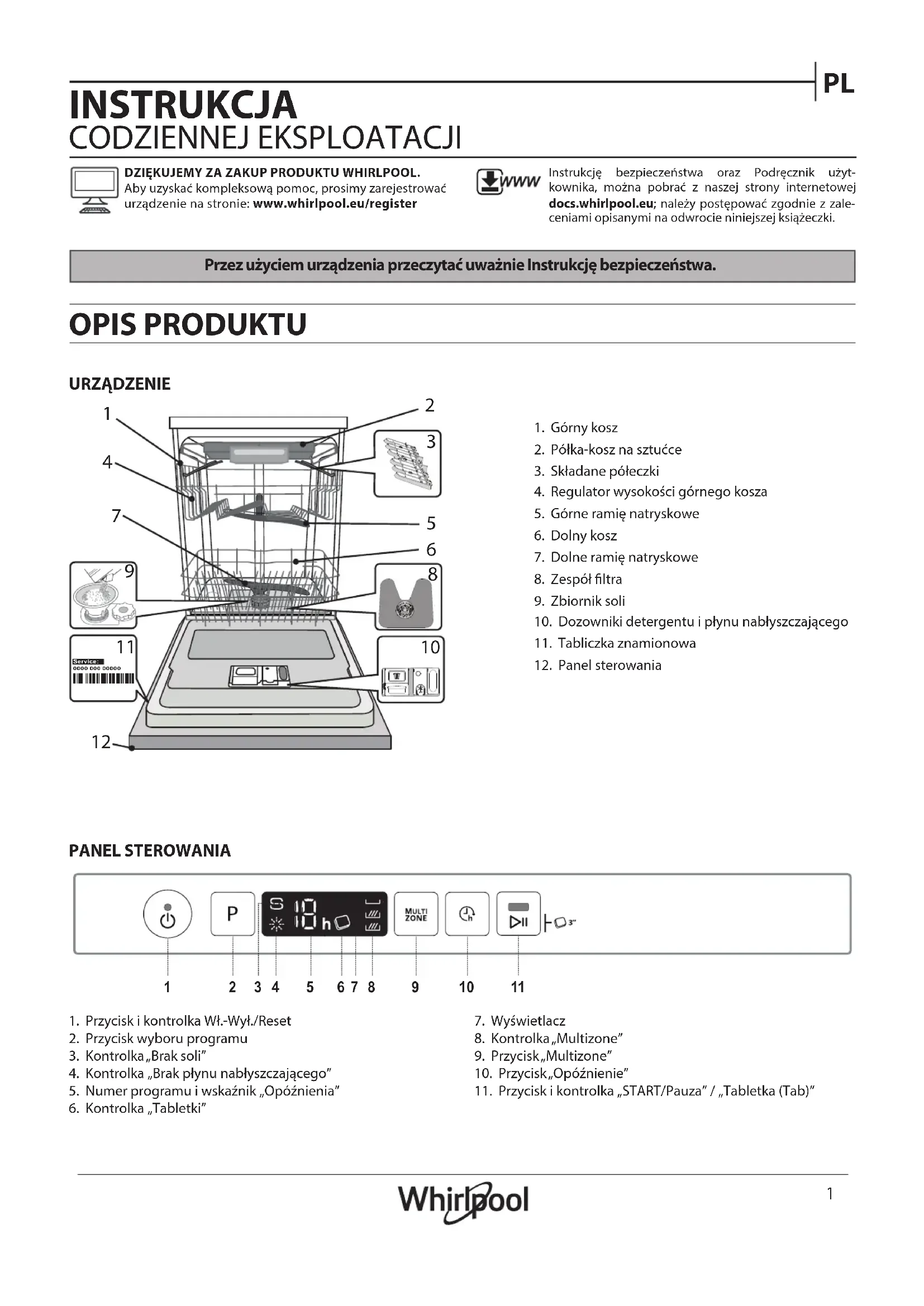 INSTRUKCJA CODZIENNEJ EKSPLOATACJI Przez użyciem urządzenia przeczytać uważnie Instrukcję bezpieczeństwa. URZĄDZENIE OPIS PRODUKTU PANEL STEROWANIA DZIĘKUJEMY ZA ZAKUP PRODUKTU WHIRLPOOL. Aby uzyskać kompleksową pomoc, prosimy zarejestrować urządzenie na stronie: www.whirlpool.eu/registerInstrukcję bezpieczeństwa oraz Podręcznik użyt-kownika, można pobrać z naszej strony internetowej docs.whirlpool.eu; należy postępować zgodnie z zale-ceniami opisanymi na odwrocie niniejszej książeczki.1. Przycisk i kontrolka Wł.-Wył./Reset2. Przycisk wyboru programu3. Kontrolka „Brak soli”4. Kontrolka „Brak płynu nabłyszczającego”5. Numer programu i wskaźnik „Opóźnienia”6. Kontrolka „Tabletki”7. Wyświetlacz 8. Kontrolka „Multizone”9. Przycisk „Multizone”10. Przycisk „Opóźnienie”11. Przycisk i kontrolka „START/Pauza” / „Tabletka (Tab)”1. Górny kosz2. Półka-kosz na sztućce3. Składane półeczki4. Regulator wysokości górnego kosza5. Górne ramię natryskowe6. Dolny kosz7. Dolne ramię natryskowe8. Zespół ltra9. Zbiornik soli10. Dozowniki detergentu i płynu nabłyszczającego11. Tabliczka znamionowa12. Panel sterowania0000 000 00000 Service: