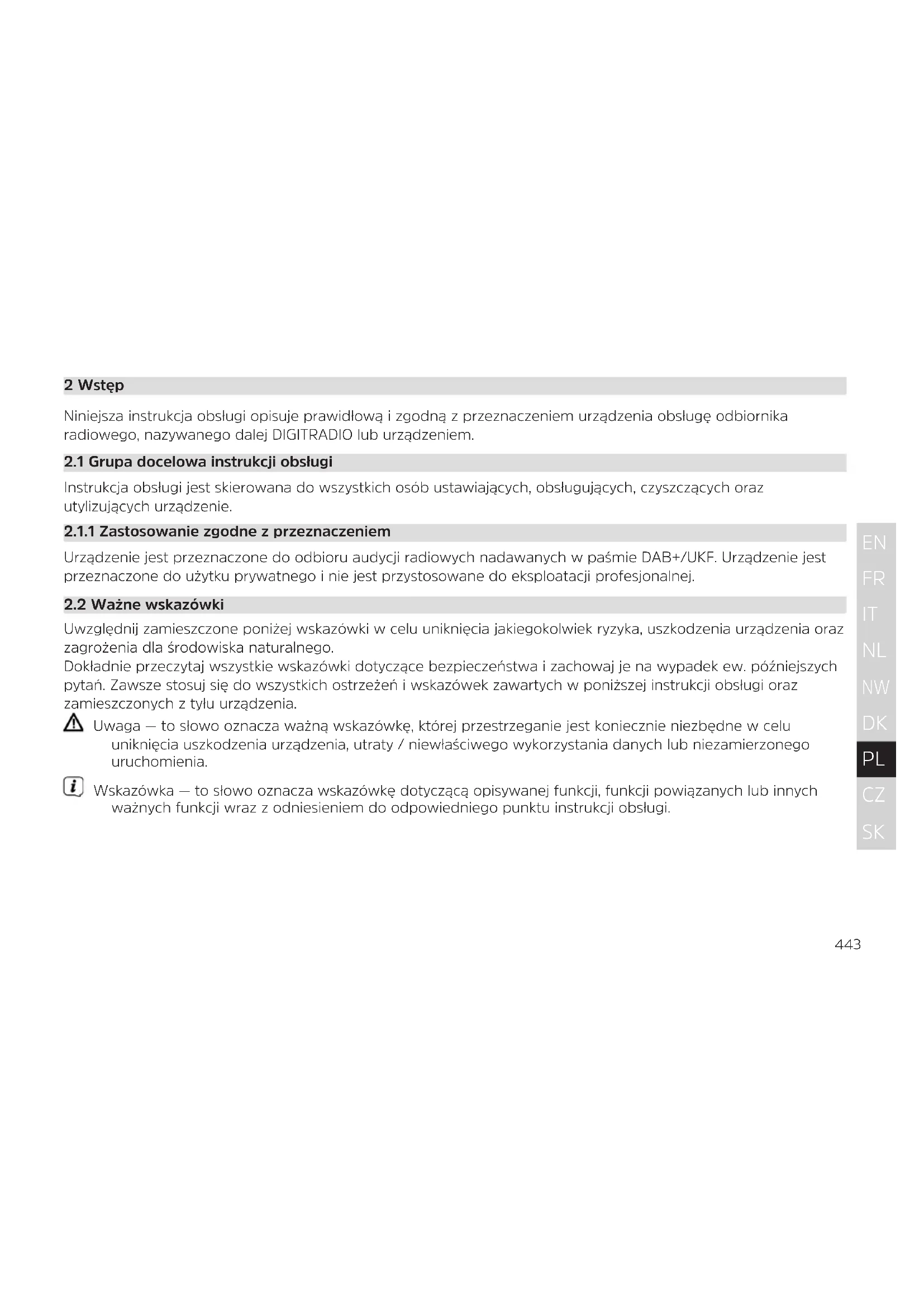 2 Wstęp Niniejsza instrukcja obsługi opisuje prawidłową i zgodną z przeznaczeniem urządzenia obsługę odbiornika radiowego, nazywanego dalej DIGITRADIO lub urządzeniem.