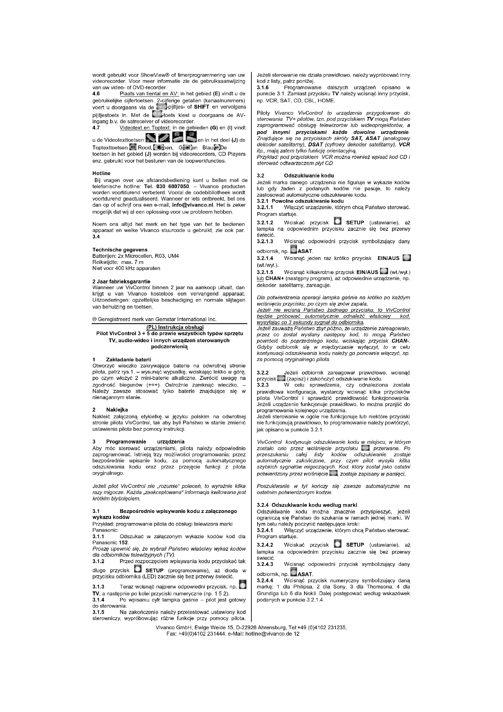 Technische gegevens Batterijen: 2x Microcellen, R03, UM4 Reikwijdte: max. 7 m Niet voor 400 kHz apparaten 2 Jaar fabrieksgarantie Wanneer uw VivControl binnen 2 jaar na aankoop uitvalt, dan krijgt u van Vivanco kosteloos een vervangend apparaat. Uitzonderingen: opzettelijke beschadiging en normale slijtagen van behuizing en toetsen. ® Geregistreerd merk van Gemstar International Inc. (PL) Instrukcja obsługi Pilot VivControl 3 + 5 do prawie wszystkich typów sprzętu TV, audio-wideo i innych urządzeń sterowanych podczerwienią 1 Zakładanie baterii Otworzyć wieczko zakrywające baterie na odwrotnej stronie pilota, patrz rys.1. – wysunąć wypustkę, wciskając lekko w górę, po czym włożyć 2 mini-baterie alkaliczne. Zwrócić uwagę na zgodność biegunów (+=+). Ostrożnie zamknąć wieczko. – Należy zawsze stosować tylko baterie znajdujące się w nienagannym stanie. 2 Naklejka Nakleić załączoną etykietkę w języku polskim na odwrotnej stronie pilota VivControl, tak aby byli Państwo w stanie zmienić ustawienia pilota bez pomocy instrukcji. 3 Programowanie urządzenia Aby móc sterować urządzeniami, pilota należy odpowiednio zaprogramować. Istnieją trzy możliwości programowania: przez bezpośrednie wpisanie kodu, za pomocą automatycznego odszukiwania kodu oraz przez przejęcie funkcji z pilota oryginalnego. Jeżeli pilot VivControl nie „rozumie“ poleceń, to wyraźnie kilka razy migocze. Każda „zaakceptowana“ informacja kwitowana jest krótkim błyśnięciem.