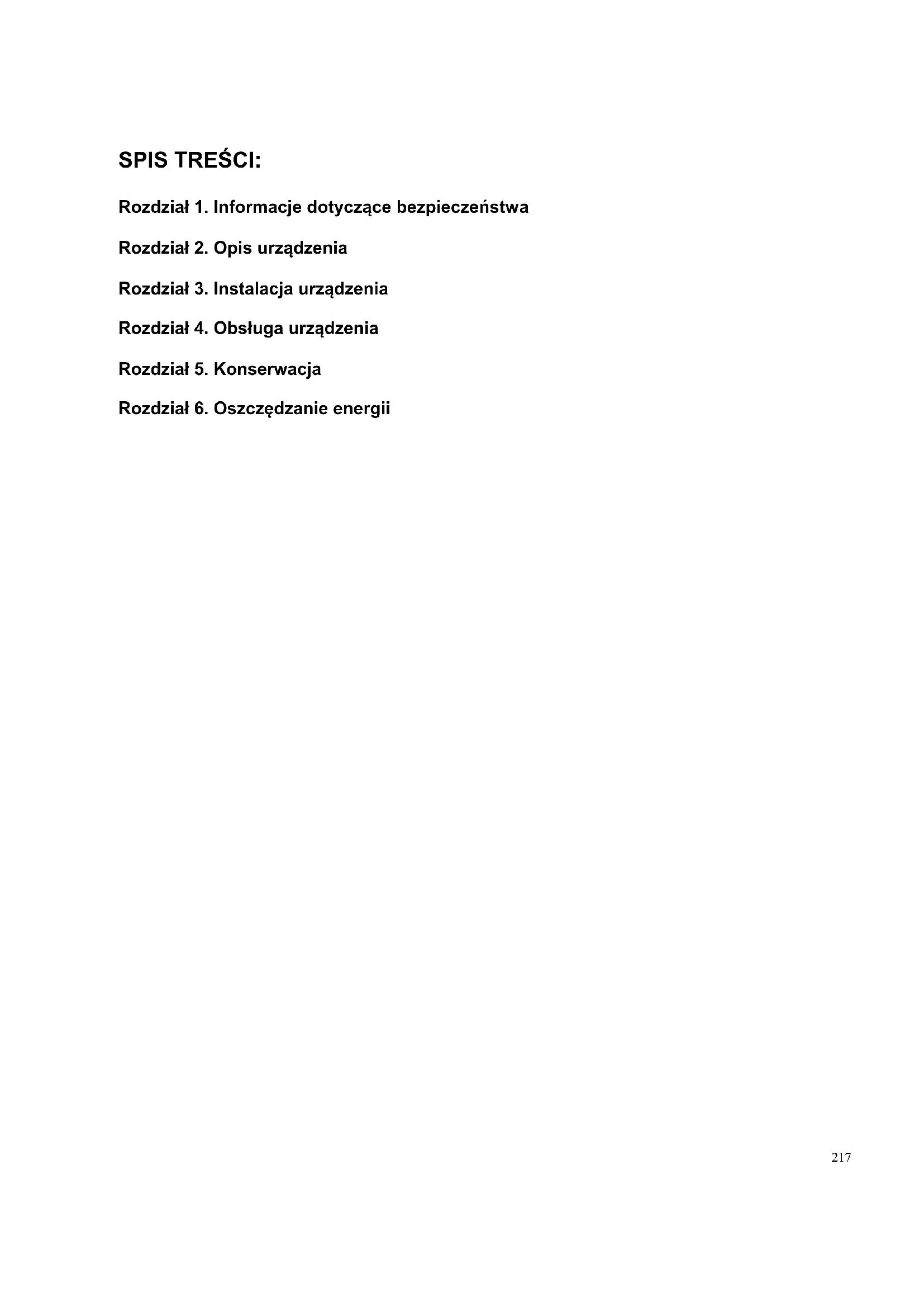Tento spotřebič je označen podle evropské směrnice 2012/19/EU o odpadních elektrických a elektronických zařízeních (OEEZ). OEEZ se týká těkavých látek (které mohou mít škodlivý vliv na životní prostředí) a základních součástí (které lze opakovaně využít). Je nutné postupovat podle OEEZ, aby se řádně zlikvidovaly všechny těkavé látky a recyklovaly všechny materiály. Jednotlivci mohou hrát významnou roli při ochranně životního prostředí. Při likvidaci je nutné dodržovat některá základní pravidla: S elektrickými a elektronickými zařízeními se nesmí zacházet jako s domovním odpadem. Elektrická a elektronická zařízení musí být odevzdávána do příslušného sběrného dvora spravovaného místní samosprávou nebo registrovanou společností. V mnoha zemích se organizuje odběr velkých elektrických a elektronických zařízení z domácností. V mnoha zemích, když koupíte nový spotřebič, můžete starý odevzdat obchodníkovi, který musí bezplatně přijmout jeden starý spotřebič za jeden nový prodaný spotřebič, pokud se jedná o ekvivalentní typ se stejným určením, jako nový zakoupený spotřebič. Shoda s předpisy Umístěním značky na tento produkt potvrzujeme shodu se všemi příslušnými evropskými směrnicemi týkajícími se bezpečnosti, ochrany zdraví a ochrany životního prostředí, které lze použít pro tento produkt.217 SPIS TREŚCI: Rozdział 1. Informacje dotyczące bezpieczeństwa Rozdział 2. Opis urządzenia Rozdział 3. Instalacja urządzenia Rozdział 4. Obsługa urządzenia Rozdział 5. Konserwacja Rozdział 6. Oszczędzanie energii218 Dziękujemy za zakup tego urządzenia. Przed rozpoczęciem użytkowania lodówki prosimy uważnie przeczytać tę instrukcję obsługi — zawarte w niej informacje pozwolą zmaksymalizować wydajność urządzenia. Całą dokumentację należy zachować w celu skorzystania z niej w przyszłości lub przekazania kolejnym właścicielom urządzenia. Urządzenie jest przeznaczone wyłącznie do użytku domowego lub podobnych zastosowań. Może być użytkowane: - w kuchniach dla personelu w sklepach, biurach i innych miejscach pracy, - w gospodarstwach rolnych, przez klientów hoteli, moteli oraz w innych środowiskach typu mieszkalnego, - w pensjonatach, - w cateringu i podobnych branżach niezwiązanych z handlem detalicznym. Urządzenie może być używane wyłącznie do przechowywania żywności, a każdy inny sposób użytkowania jest uznawany za niebezpieczny i producent nie ponosi odpowiedzialności za jego skutki. Zalecane jest zapoznanie się z warunkami gwarancji. W celu zapewnienia jak najlepszej i bezproblemowej pracy urządzenia należy uważnie przeczytać tę instrukcję. Niestosowanie się do instrukcji może skutkować utratą prawa do bezpłatnego serwisowania w okresie obowiązywania gwarancji.219 Rozdział 1. INFORMACJE DOTYCZĄCE BEZPIECZEŃSTWA Podręcznik zawiera wiele ważnych informacji dotyczących bezpieczeństwa. W celu zagwarantowania bezproblemowej eksploatacji urządzenia zalecamy odłożenie dokumentacji w bezpieczne miejsce. Urządzenie wykorzystuje czynnik chłodniczy (R600a: izobutan) oraz gaz izolacyjny (cyklopentan). Substancje te spełniają wymogi dotyczące ochrony środowiska, jednak są łatwopalne. Ostrożnie: ryzyko pożaru W razie uszkodzenia obwodu czynnika chłodniczego: Unikać nieosłoniętych płomieni i nie korzystać ze źródeł zapłonu. Dokładnie przewietrzyć pomieszczenie, w którym znajduje się urządzenie. Cykle pracy agregatu: OSTRZEŻENIE! Podczas czyszczenia/przenoszenia zamrażarki należy zachować ostrożność, tak aby nie dotknąć znajdujących się z tyłu metalowych przewodów sprężarki, ponieważ grozi to obrażeniami palców lub dłoni albo uszkodzeniem produktu.