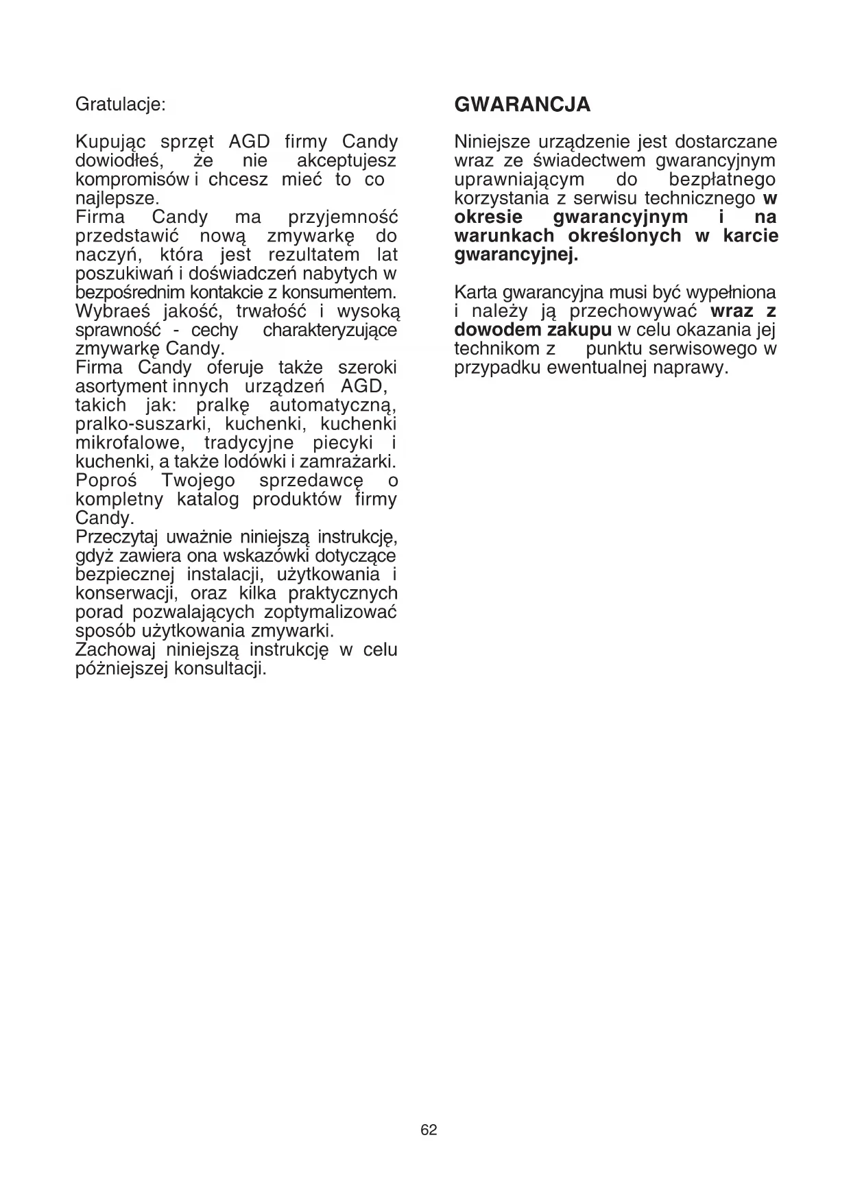 Gratulacje: Kupujàc sprz´t AGD firmy Candy dowiod∏eÊ, ˝e nie akceptujesz kompromisów i chcesz mieç to co najlepsze. Firma Candy ma przyjemnoÊç przedstawiç nowà zmywark´ do naczyƒ, która jest rezultatem lat poszukiwaƒ i doÊwiadczeƒ nabytych w bezpoÊrednim kontakcie z konsumentem. WybraeÊ jakoÊç, trwa∏oÊç i wysokà sprawnoÊç - cechy charakteryzujàce zmywark´ Candy. Firma Candy oferuje tak˝e szeroki asortyment innych urzàdzeƒ AGD, takich jak: pralk´ automatycznà, pralko-suszarki, kuchenki, kuchenki mikrofalowe, tradycyjne piecyki i kuchenki, a tak˝e lodówki i zamra˝arki. PoproÊ Twojego sprzedawc´ o kompletny katalog produktów firmy Candy. Przeczytaj uwa˝nie niniejszà instrukcj´, gdy˝ zawiera ona wskazówki dotyczàce bezpiecznej instalacji, u˝ytkowania i konserwacji, oraz kilka praktycznych porad pozwalajàcych zoptymalizowaç sposób u˝ytkowania zmywarki. Zachowaj niniejszà instrukcj´ w celu pó˝niejszej konsultacji. GWARANCJA Niniejsze urzàdzenie jest dostarczane wraz ze Êwiadectwem gwarancyjnym uprawniajàcym do bezp∏atnego korzystania z serwisu technicznego w okresie gwarancyjnym i na warunkach okreÊlonych w karcie gwarancyjnej. Karta gwarancyjna musi byç wype∏niona i nale˝y jà przechowywaç wraz z dowodem zakupu w celu okazania jej technikom z punktu serwisowego w przypadku ewentualnej naprawy.63