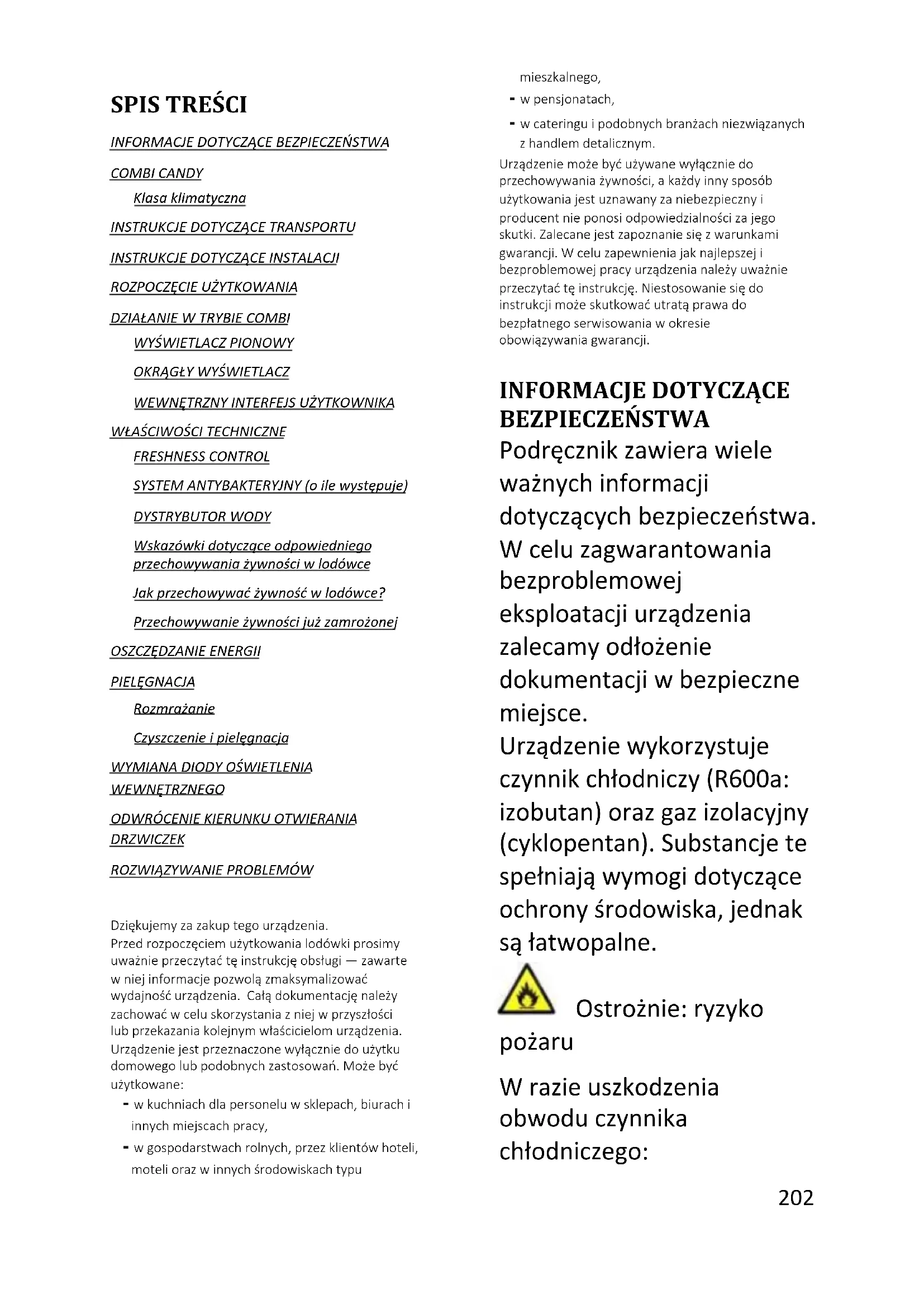 INFORMACJE DOTYCZĄCE BEZPIECZEŃSTWA COMBI CANDY Klasa klimatyczna INSTRUKCJE DOTYCZĄCE TRANSPORTU INSTRUKCJE DOTYCZĄCE INSTALACJI ROZPOCZĘCIE UŻYTKOWANIA DZIAŁANIE W TRYBIE COMBI WYŚWIETLACZ PIONOWY OKRĄGŁY WYŚWIETLACZ WEWNĘTRZNY INTERFEJS UŻYTKOWNIKA WŁAŚCIWOŚCI TECHNICZNE FRESHNESS CONTROL SYSTEM ANTYBAKTERYJNY (o ile występuje) DYSTRYBUTOR WODY Wskazówki dotyczące odpowiedniego przechowywania żywności w lodówce Jak przechowywać żywność w lodówce? Przechowywanie żywności już zamrożonej OSZCZĘDZANIE ENERGII PIELĘGNACJA Rozmrażanie Czyszczenie i pielęgnacja WYMIANA DIODY OŚWIETLENIA WEWNĘTRZNEGO ODWRÓCENIE KIERUNKU OTWIERANIA DRZWICZEK ROZWIĄZYWANIE PROBLEMÓW Dziękujemy za zakup tego urządzenia. Przed rozpoczęciem użytkowania lodówki prosimy uważnie przeczytać tę instrukcję obsługi — zawarte w niej informacje pozwolą zmaksymalizować wydajność urządzenia. Całą dokumentację należy zachować w celu skorzystania z niej w przyszłości lub przekazania kolejnym właścicielom urządzenia. Urządzenie jest przeznaczone wyłącznie do użytku domowego lub podobnych zastosowań. Może być użytkowane: - w kuchniach dla personelu w sklepach, biurach i innych miejscach pracy, - w gospodarstwach rolnych, przez klientów hoteli, moteli oraz w innych środowiskach typu mieszkalnego, - w pensjonatach, - w cateringu i podobnych branżach niezwiązanych z handlem detalicznym. Urządzenie może być używane wyłącznie do przechowywania żywności, a każdy inny sposób użytkowania jest uznawany za niebezpieczny i producent nie ponosi odpowiedzialności za jego skutki. Zalecane jest zapoznanie się z warunkami gwarancji. W celu zapewnienia jak najlepszej i bezproblemowej pracy urządzenia należy uważnie przeczytać tę instrukcję. Niestosowanie się do instrukcji może skutkować utratą prawa do bezpłatnego serwisowania w okresie obowiązywania gwarancji.
