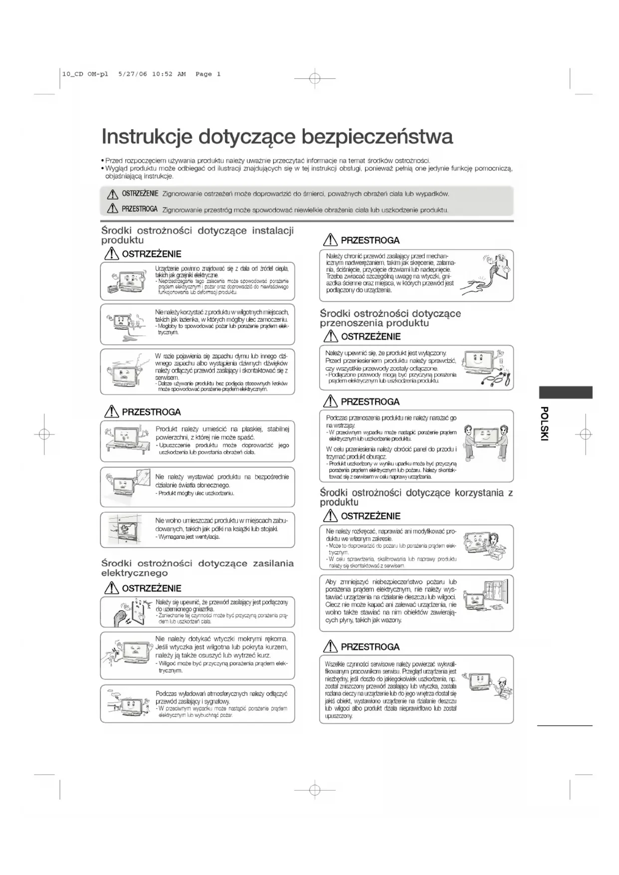 Emierci, powa˝nych obra˝e? cia∏a lub wypadkow. Zignorowanie przestrog mo˝e spowodowac niewielkie obra˝enia cia∏a lub uszkodzenie produktu. OSTRZE˚ENIE PRZESTROGA 10_CD OM-pl 5/27/06 10:52