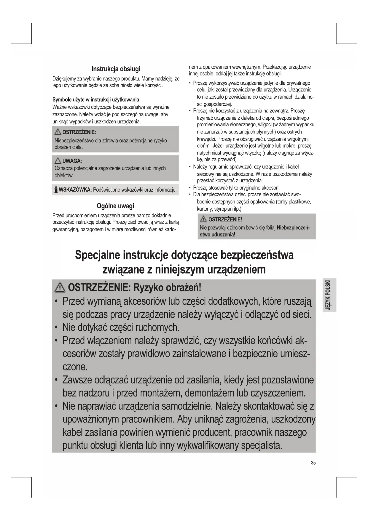 - Dla bezpieczeństwa dzieci proszę nie zostawiać swo- bodnie dostępnych części opakowania (torby plastikowe, kartony, styropian itp.). OSTRZEŻENIE! Nie pozwalaj dzieciom bawić się folią. Niebezpieczeń- stwo uduszenia! Specjalne instrukcje dotyczące bezpieczeństwa związane z niniejszym urządzeniem OSTRZEŻENIE: Ryzyko obrażeń!