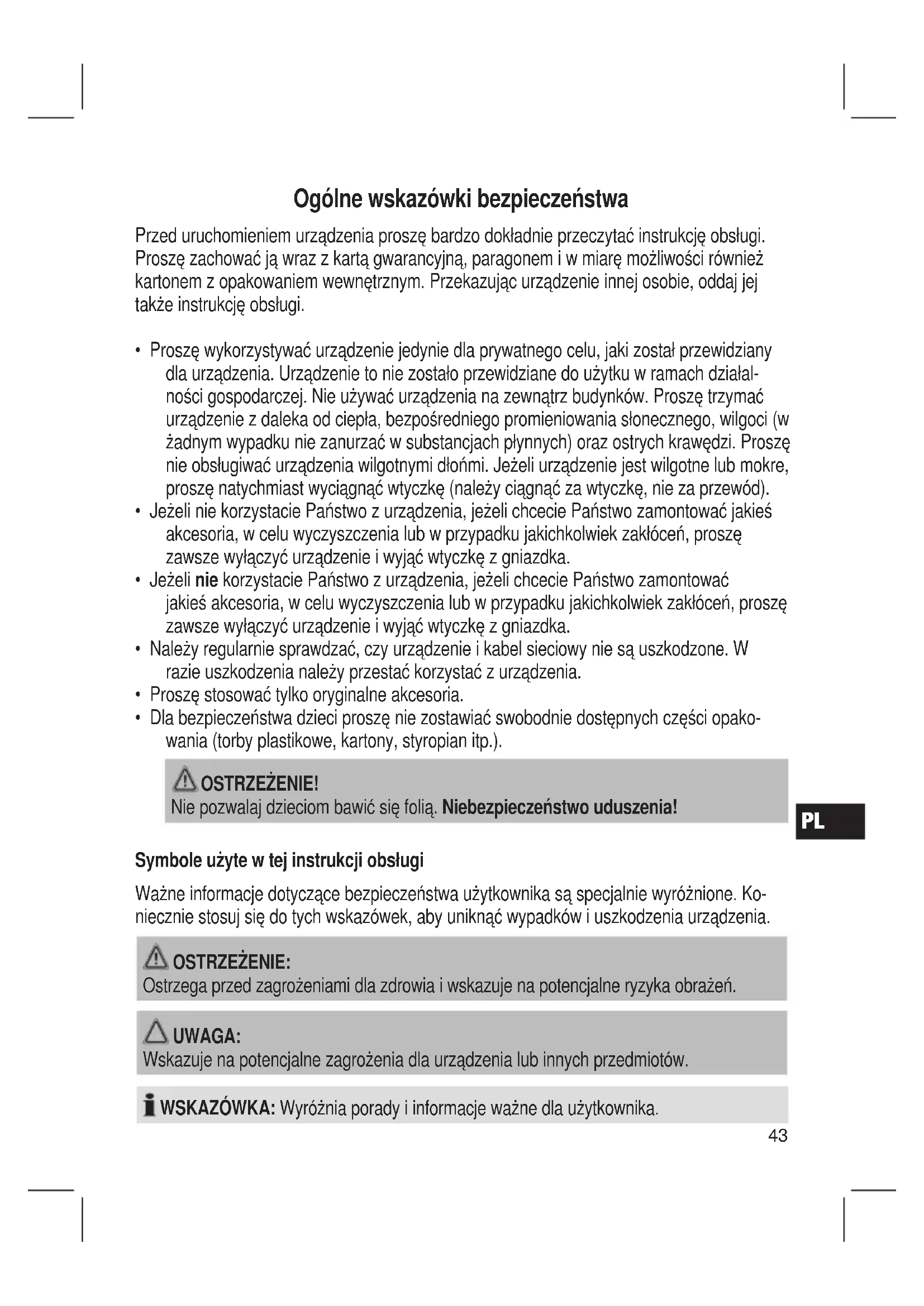 Ogólne wskazówki bezpieczeństwa Przed uruchomieniem urządzenia proszę bardzo dokładnie przeczytać instrukcję obsługi. Proszę zachować ją wraz z kartą gwarancyjną, paragonem i w miarę możliwości również kartonem z opakowaniem wewnętrznym. Przekazując urządzenie innej osobie, oddaj jej także instrukcję obsługi.