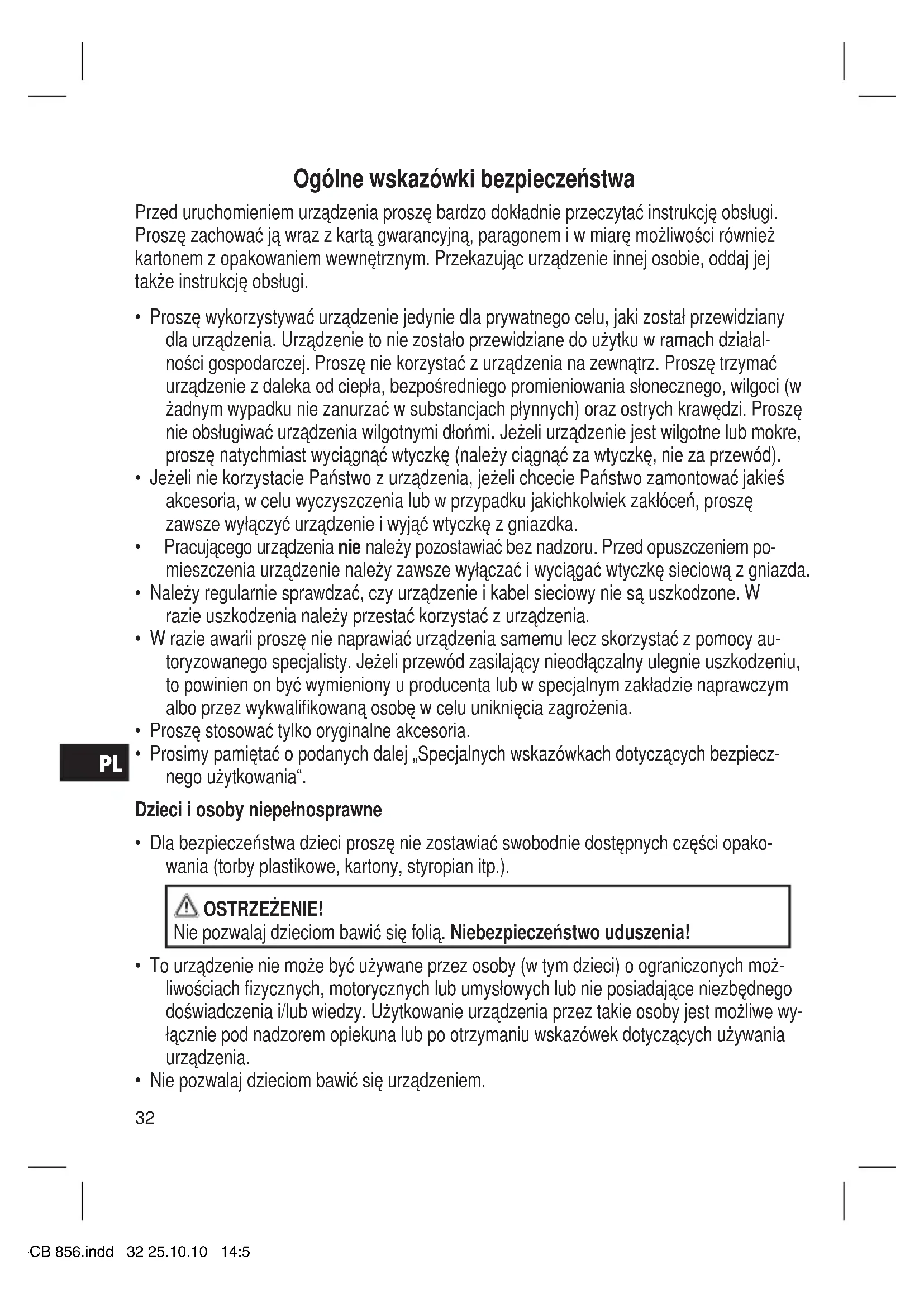 - Nie pozwalaj dzieciom bawić się urządzeniem. 05-CB 856.indd 32 25.10.10 14:52PL