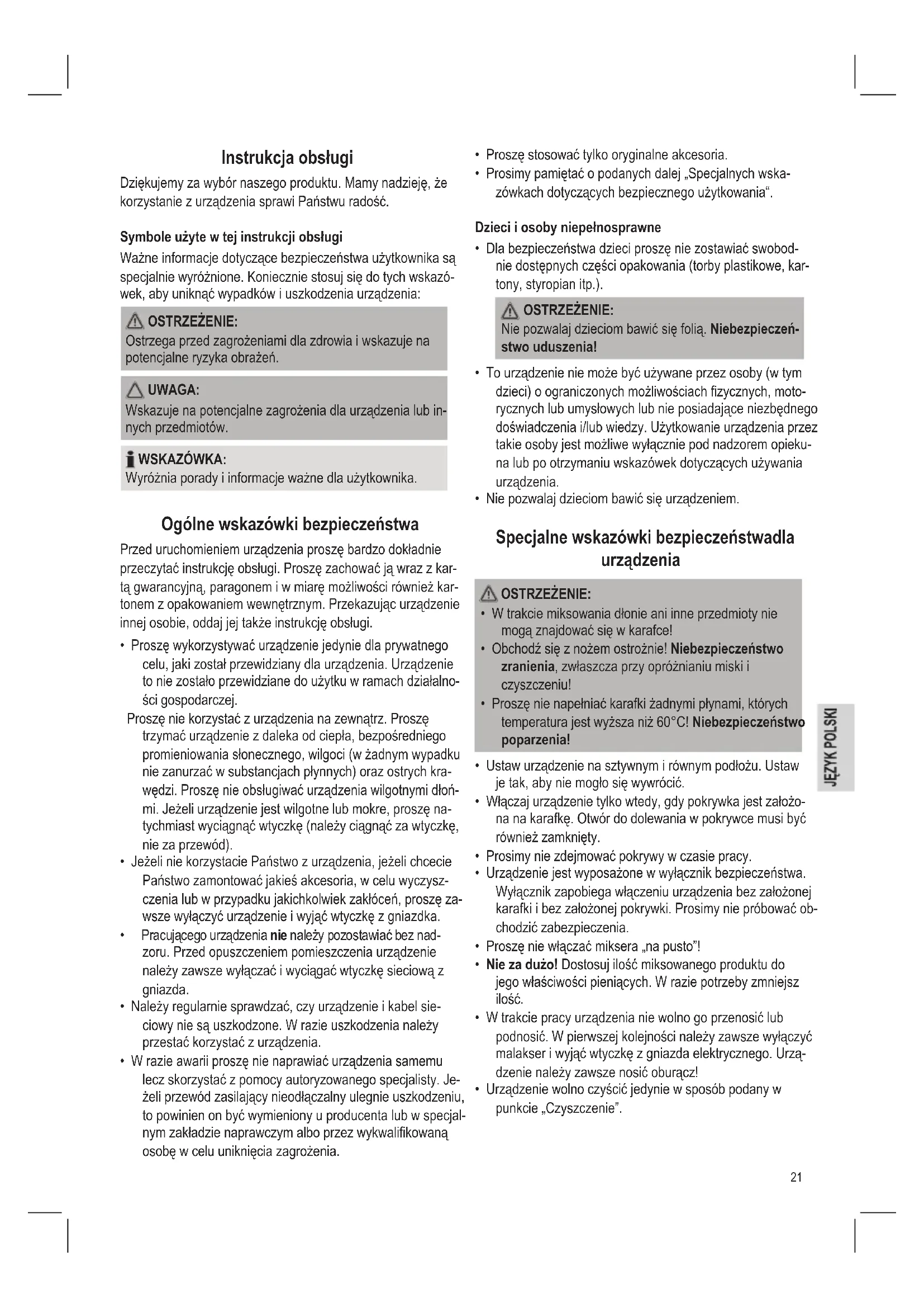 - W trakcie miksowania dłonie ani inne przedmioty nie mogą znajdować się w karafce!