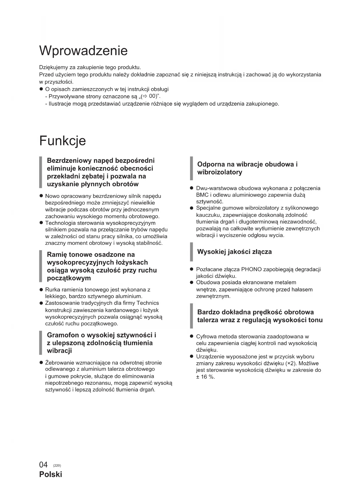 4-nastainen kaapelikenkä Tekniset tiedot voivat muuttua ilman erillistä ilmoitusta. 27Polski (220) Funkcje Wprowadzenie Dziękujemy za zakupienie tego produktu. Przed użyciem tego produktu należy dokładnie zapoznać się z niniejszą instrukcją i zachować ją do wykorzystania w przyszłości.