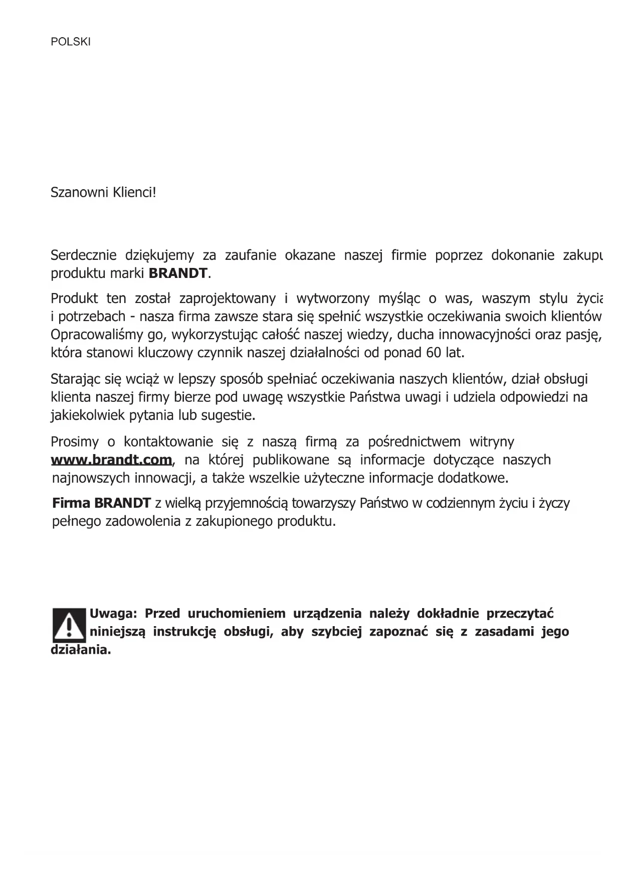 STEAM TESTS: as per IEC 60350-1 Art. 8 Broccoli 100% steam 500 g 18 min. dish 1 inside dish 2 Frozen peas 100% steam 1000 g 27 min. dish 1 inside dish 2POLSKI Szanowni Klienci! Serdecznie dziękujemy za zaufanie okazane naszej firmie poprzez dokonanie zakupu produktu marki BRANDT. Produkt ten został zaprojektowany i wytworzony myśląc o was, waszym stylu życia i potrzebach - nasza firma zawsze stara się spełnić wszystkie oczekiwania swoich klientów. Opracowaliśmy go, wykorzystując całość naszej wiedzy, ducha innowacyjności oraz pasję, która stanowi kluczowy czynnik naszej działalności od ponad 60 lat. Starając się wciąż w lepszy sposób spełniać oczekiwania naszych klientów, dział obsługi klienta naszej firmy bierze pod uwagę wszystkie Państwa uwagi i udziela odpowiedzi na jakiekolwiek pytania lub sugestie. Prosimy o kontaktowanie się z naszą firmą za pośrednictwem witryny www.brandt.com , na której publikowane są informacje dotyczące naszych najnowszych innowacji, a także wszelkie użyteczne informacje dodatkowe. Firma BRANDT z wielką przyjemnością towarzyszy Państwo w codziennym życiu i życzy pełnego zadowolenia z zakupionego produktu. Uwaga: Przed uruchomieniem urządzenia należy dokładnie przeczytać niniejszą instrukcję obsługi, aby szybciej zapoznać się z zasadami jego działania.POLSKI WAŻNE ZALECENIA BEZPIECZEŃSTWA - UWAŻNIE PRZECZYTAĆ I ZACHOWAĆ DO WGLĄDU. Niniejszą instrukcję obsługi można pobrać na stronie internetowej marki. Urządzenie może być używane przez dzieci w wieku powyżej 8 lat i osoby, o ograniczonych możliwościach fizycznych, czuciowych lub umysłowych lub pozbawionych doświadczenia lub wiedzy, jeżeli są one pod nadzorem lub wcześniej otrzymały instrukcje dotyczące pewnej obsługi urządzenia i zrozumiały zagrożenia, którym mogą podlegać. Dzieci nie mogą wykorzystywać urządzenia do zabawy. Czyszczenie i konserwacja nie mogą być wykonywane przez dzieci pozostawione bez dozoru. — Należy nadzorować dzieci, aby upewnić się, że nie bawią się urządzeniem. OSTRZEŻENIE: Urządzenie i jego elementy dostępne podczas używania go stają się gorące. Należy uważać, żeby nie dotykać elementów grzejnych znajdujących się wewnątrz piekarnika. Dzieci w wieku poniżej 8 lat należy trzymać z dala od urządzenia, chyba że znajdują się pod stałym nadzorem. — Nie używać urządzenia do czyszczenia parą. — Nie stosować do czyszczenia szklanych drzwi piekarnika ściernych preparatów czyszczących ani twardych metalowych drapaków, ponieważ można porysować powierzchnię i spowodować pęknięcie szkła. OSTRZEŻENIE: Upewnić się, że urządzenie jest wyłączone od zasilania przed przystąpieniem do wymiany lampy, aby uniknąć ryzyka porażenia prądem. Rozpocząć czynności po ostygnięciu urządzenia. Aby odkręcić oprawę i lampę, używać gumowej rękawicy, która ułatwi demontaż. Gniazdko prądu powinno być dostępne po instalacji. Należy przewidzieć sposób odłączenia urządzenia od sieci zasilającej za pomocą gniazdka prądu lub zintegrowanego wyłącznika w stałym układzie przewodów zgodnie z regułami instalacji. Jeśli kabel zasilania jest uszkodzony, powinien zostać wymieniony przez producenta, jego serwis posprzedażny lub osoby o podobnych