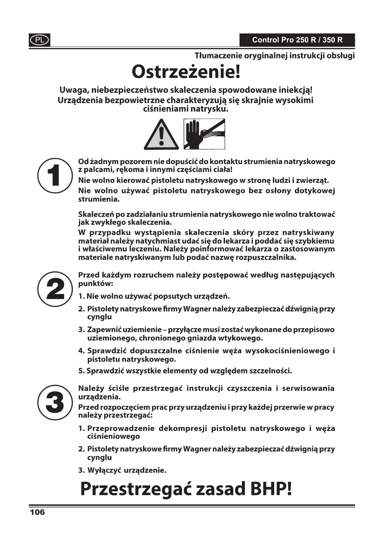 Od żadnym pozorem nie dopuścić do kontaktu strumienia natryskowego z palcami, rękoma i innymi częściami ciała!