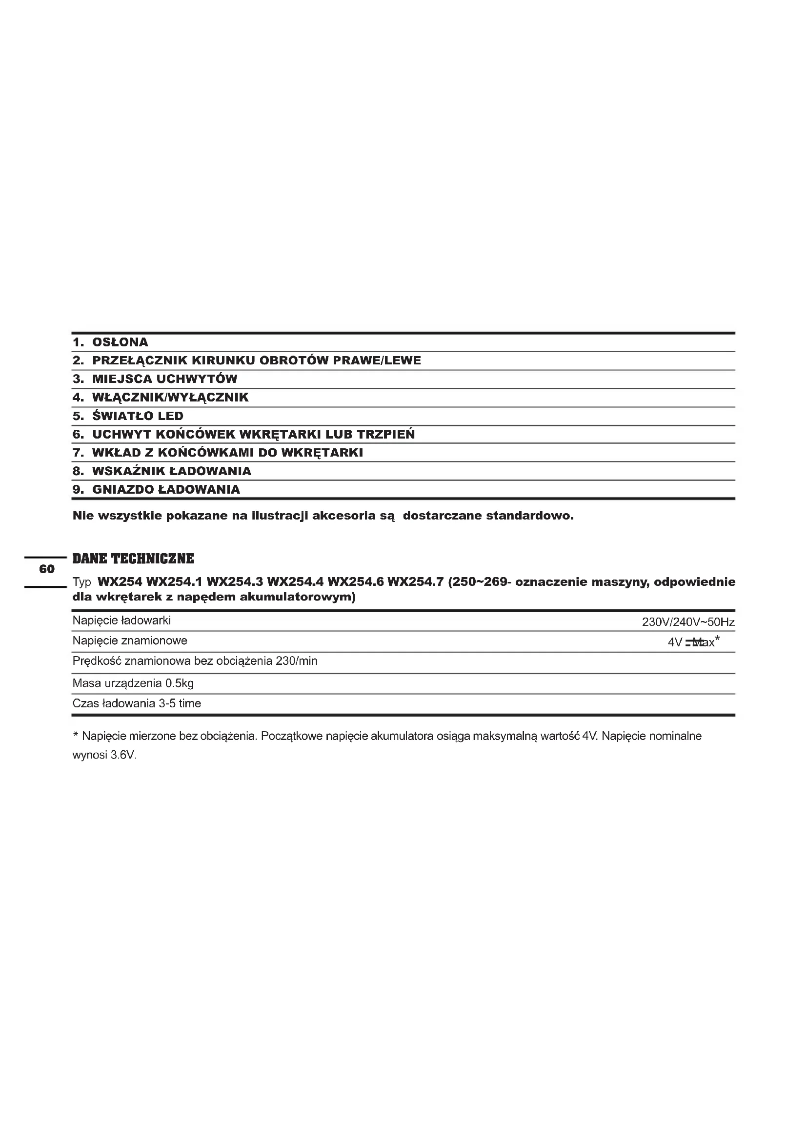 Nie wszystkie pokazane na ilustracji akcesoria są dostarczane standardowo. DANE TECHNICZNE Typ WX254 WX254.1 WX254.3 WX254.4 WX254.6 WX254.7 (250~269- oznaczenie maszyny, odpowiednie dla wkrętarek z napędem akumulatorowym) Napięcie ładowarki 230V/240V~50Hz Napięcie znamionowe 4V Max* Prędkość znamionowa bez obciążenia 230/min Masa urządzenia 0.5kg Czas ładowania 3-5 time