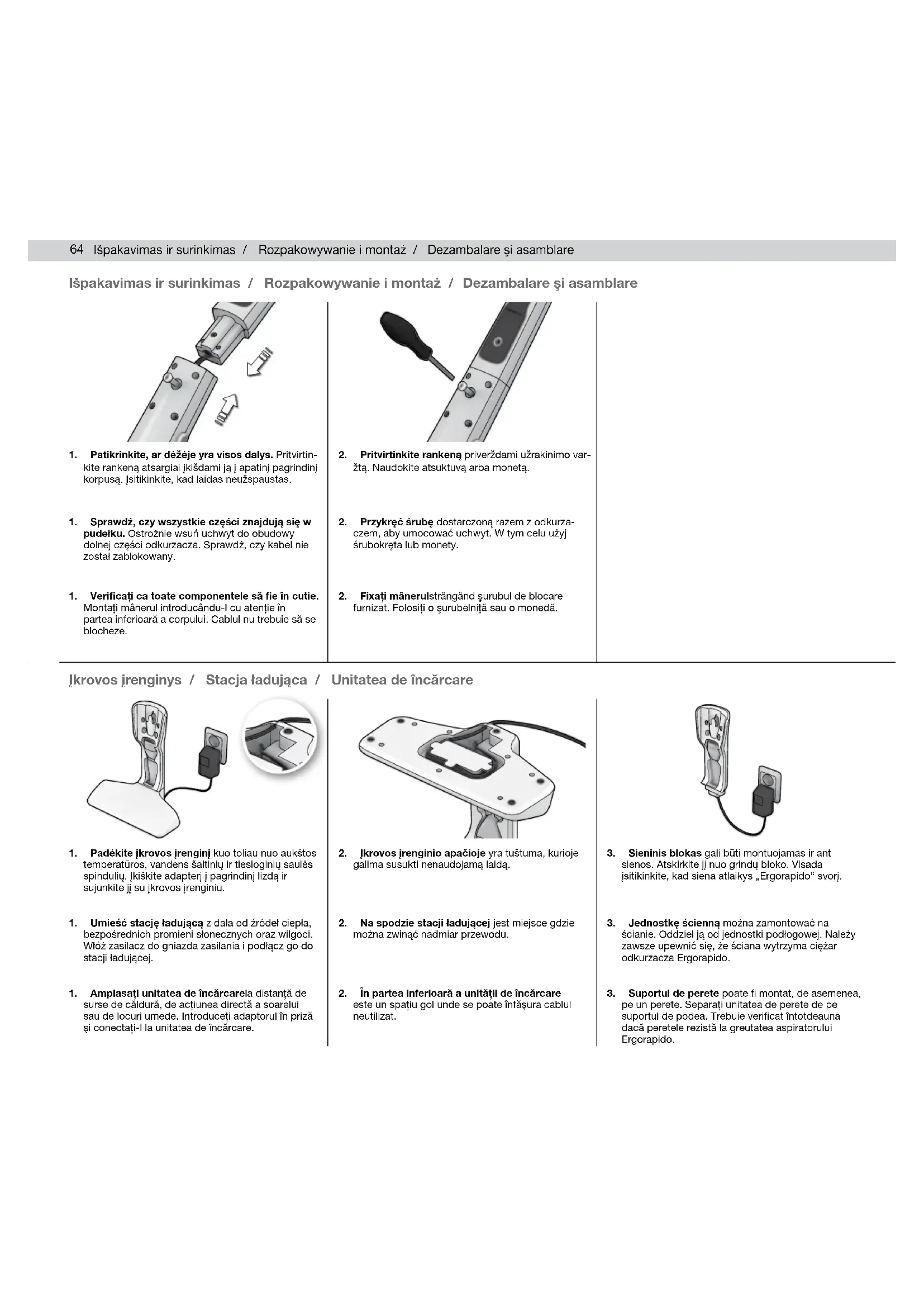 Turinys Lietuviškai Turinys Išpakavimas ir surinkimas 64 Įkrovimas 65 Siurbimas 66 Ištuštinimas ir valymas 67 Ritininio šepečio, žarnos ir ratukų valymas 68 Maitinimo elementų išėmimas 69 Atsargumo priemonės 70 Informacija naudotojams 71 Funkcijos./.priedai 1 Įjungimo / išjungimo mygtukas 2 Įjungimo / išjungimo mygtukas, rankinis blokas 3 Rankena 4 Užrakinimo varžtas 5 Atleidimo mygtukas, rankinis blokas 6 Įkrovos įrenginys, sieninis blokas 7 Įkrovos įrenginys, grindų blokas 8 Adapteris 9 Plonas ltras (vidinis ltras) 10 Pirminis ltras (išorinis ltras) 11 Atleidimo mygtukas, dulkių surinktuvas 12 Maitinimo elemento ekranas, ličio versija* 13 Dulkių surinktuvas 14 Dulkių siurblio dangtelis 15 Šepetys 16 Plyšių valymo antgalis 17 Ritininio šepečio atleidimo mygtukas 18 Ritininio šepečio angos dangtis 19 Ritininis šepetys 20 Priekinės antgalio lemputės 21 Įkrovos indikatorius, NiMH versija 22 Pastatymo juosta 23 Atlaisvinimo mygtukas, įkrovos įrenginys *„Ergorapido Plus“ Polski Spis.treści Rozpakowywanie i montaż 64 Ładowanie 65 Odkurzanie 66 Opróżnianie i czyszczenie 67 Czyszczenie szczotki rolkowej, węża i kółek 68 Usuwanie baterii 69 Wskazówki dotyczące bezpieczeństwa 70 Informacje dla klienta 71 Funkcje/Akcesoria 1 Przycisk włączania/wyłączania 2 Przycisk włącz/wyłącz, jednostka ręczna 3 Uchwyt 4 Śruba blokująca 5 Przycisk zwalniający, jednostka ręczna 6 Stacja ładująca, jednostka ścienna 7 Stacja ładująca, jednostka podłogowa 8 Zasilacz 9 Filtr dokładny (wewnętrzny) 10 Filtr wstępny (zewnętrzny) 11 Przycisk zwalniający, pojemnik na kurz 12 Wyświetlacz baterii, wersja litowa* 13 Pojemnik na kurz 14 Pokrywa odkurzacza 15 Szczotka 16 Ssawka do odkurzania szczelin 17 Przycisk zwalniający szczotkę rolkową 18 Pokrywa ochronna szczotki rolkowej 19 Szczotka rolkowa 20 Przednie oświetlenie ssawki 21 Wskaźnik ładowania, wersja NiMH 22 Pasek podtrzymujący 23 Przycisk zwalniający, stacja ładująca *Ergorapido Plus / Spis treści Română Cuprins Dezambalare şi asamblare 64 Încărcarea 65 Aspirarea 66 Golirea şi curăţarea 67 Curăţarea ruloului cu perii, a furtunului şi a roţilor 68 Îndepărtarea bateriilor 69 Precauţii de siguranţă 70 Informaţii pentru clienţi 71 Funcţii/Accesorii 1 Buton pornit/oprit 2 Buton PORNIRE - OPRIRE, unitate portabilă 3 Mâner 4 Şurub de blocare 5 Buton de eliberare, unitate portabilă 6 Unitate de încărcare, suport de perete 7 Unitate de încărcare, suport de podea 8 Adaptor 9 Filtru n (ltru interior) 10 Preltru (ltru exterior) 11 Buton de eliberare, container pentru praf 12 Aşaj baterie, versiunea pe bază de litiu* 13 Container de praf 14 Capac aspirator 15 Perie 16 Duză pentru spaţii înguste 17 Buton detaşare turbo perie 18 Capac siguranta turbo perie 19 Turbo perie 20 Lămpi frontale duză 21 Indicator de încărcare, versiunea NiMH 22 Bandă parcare 23 Buton de eliberare unitate de incarcare podea *Ergorapido Plus / Conţinut64 Išpakavimas.ir.surinkimas../.. Įkrovos.įrenginys../..