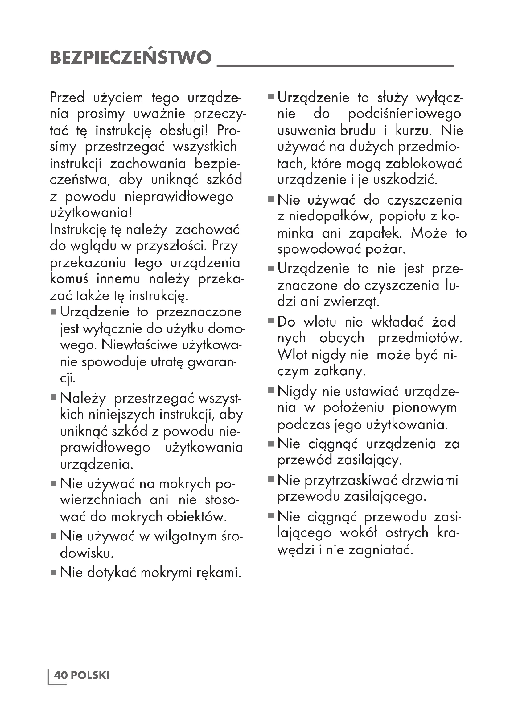 , 50-60 Hz Snaga : 800 W Polumjer rada : 9 m Kapacitet prašine : 4 L Filtar : HEPA12 Dizajn i specifikacije su podložni promjenu bez prethodne obavijesti. INFORMACIJE _____________________________40 POLSKI BEZPIECZEŃSTWO _________________________ Przed użyciem tego urządze- nia prosimy uważnie przeczy- tać tę instrukcję obsługi! Pro- simy przestrzegać wszystkich instrukcji zachowania bezpie- czeństwa, aby uniknąć szkód z powodu nieprawidłowego użytkowania! Instrukcję tę należy zachować do wglądu w przyszłości. Przy przekazaniu tego urządzenia komuś innemu należy przeka- zać także tę instrukcję.