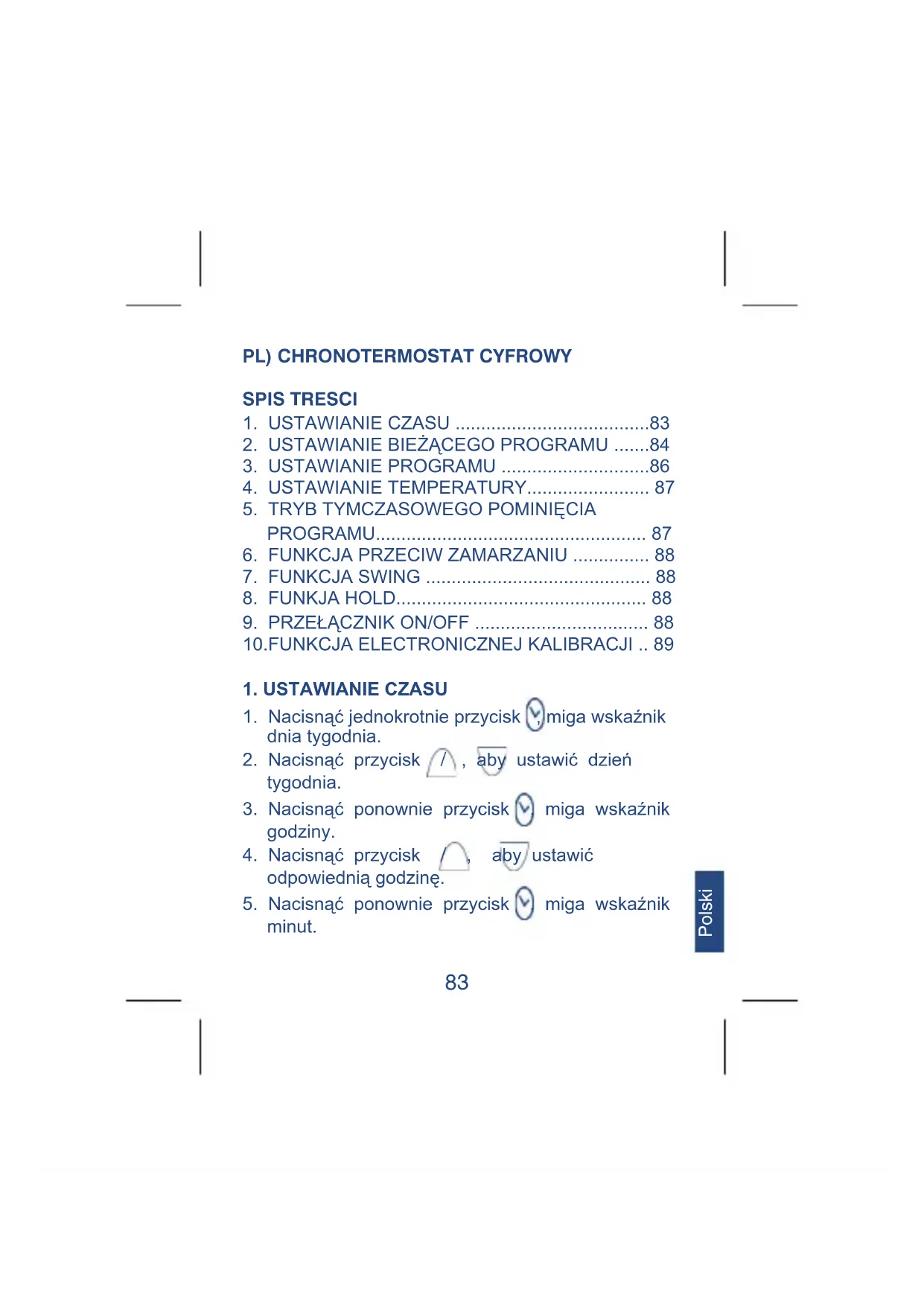 prog, można nacisnąć przycisk / , aby ustawić kolejny program i powtórzyć powyższą procedurę od 3 – a. Program #1 i #2 jest ustawiony. Nie można modyfikować tych dwóch programów w celu ustawinia temperatury komfortowej dla #1 lub ekonomicznej #2.86 Polski