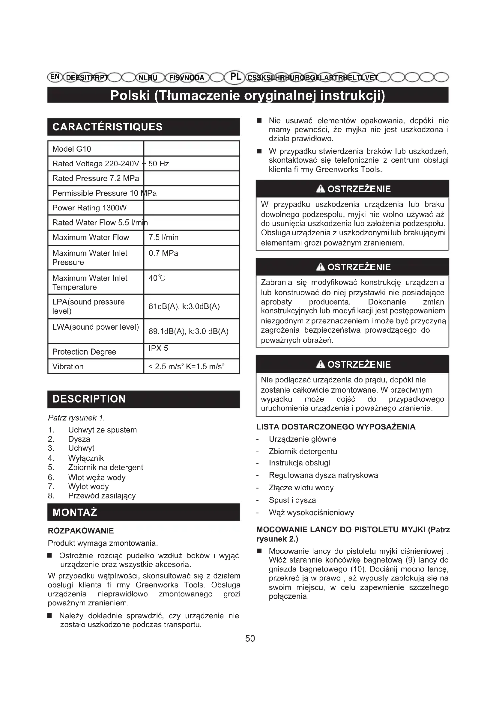 G10 - Myjka ciśnieniowa GREENWORKS - Bezpłatna instrukcja obsługi