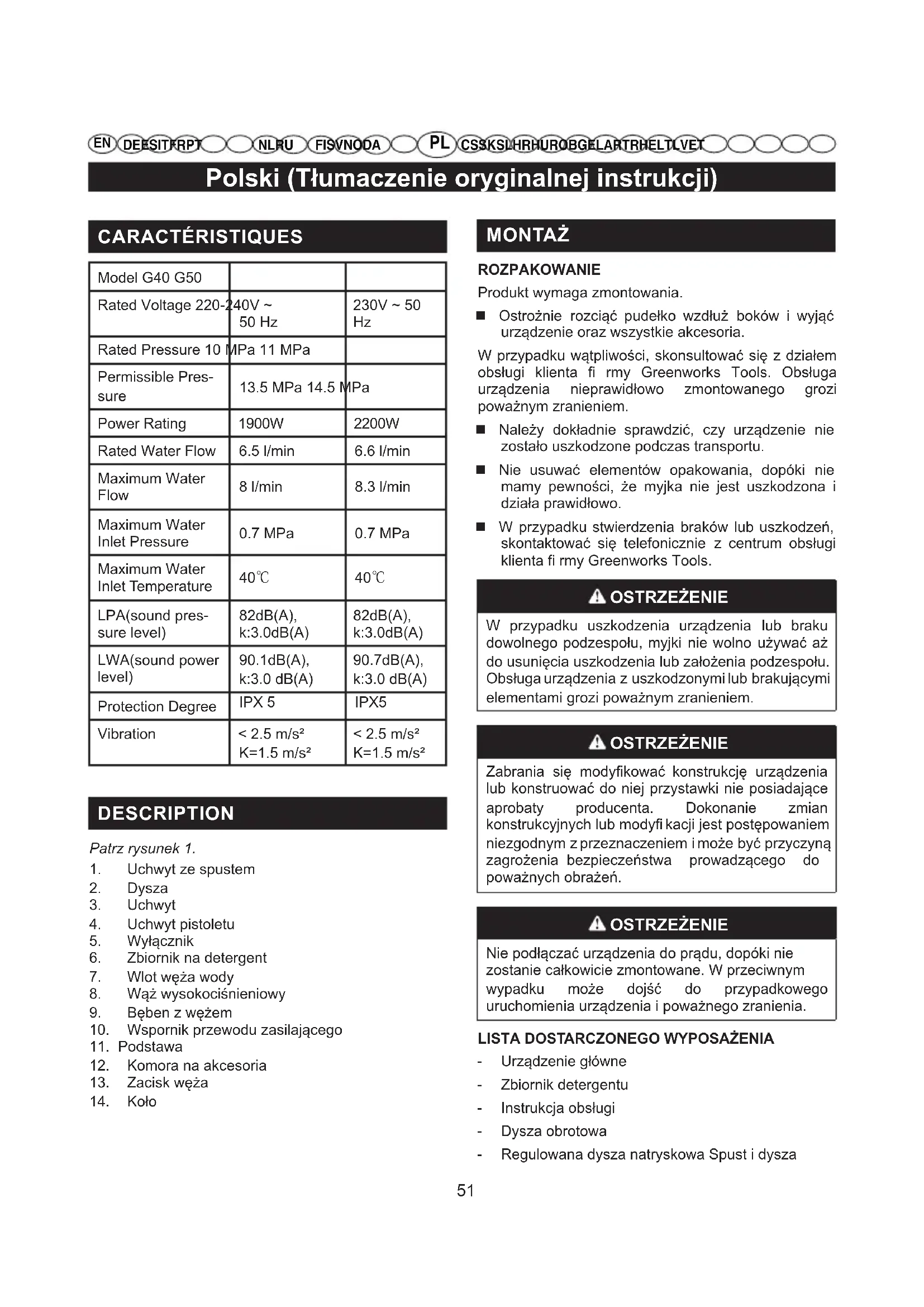G50 - Myjka ciśnieniowa GREENWORKS - Bezpłatna instrukcja obsługi