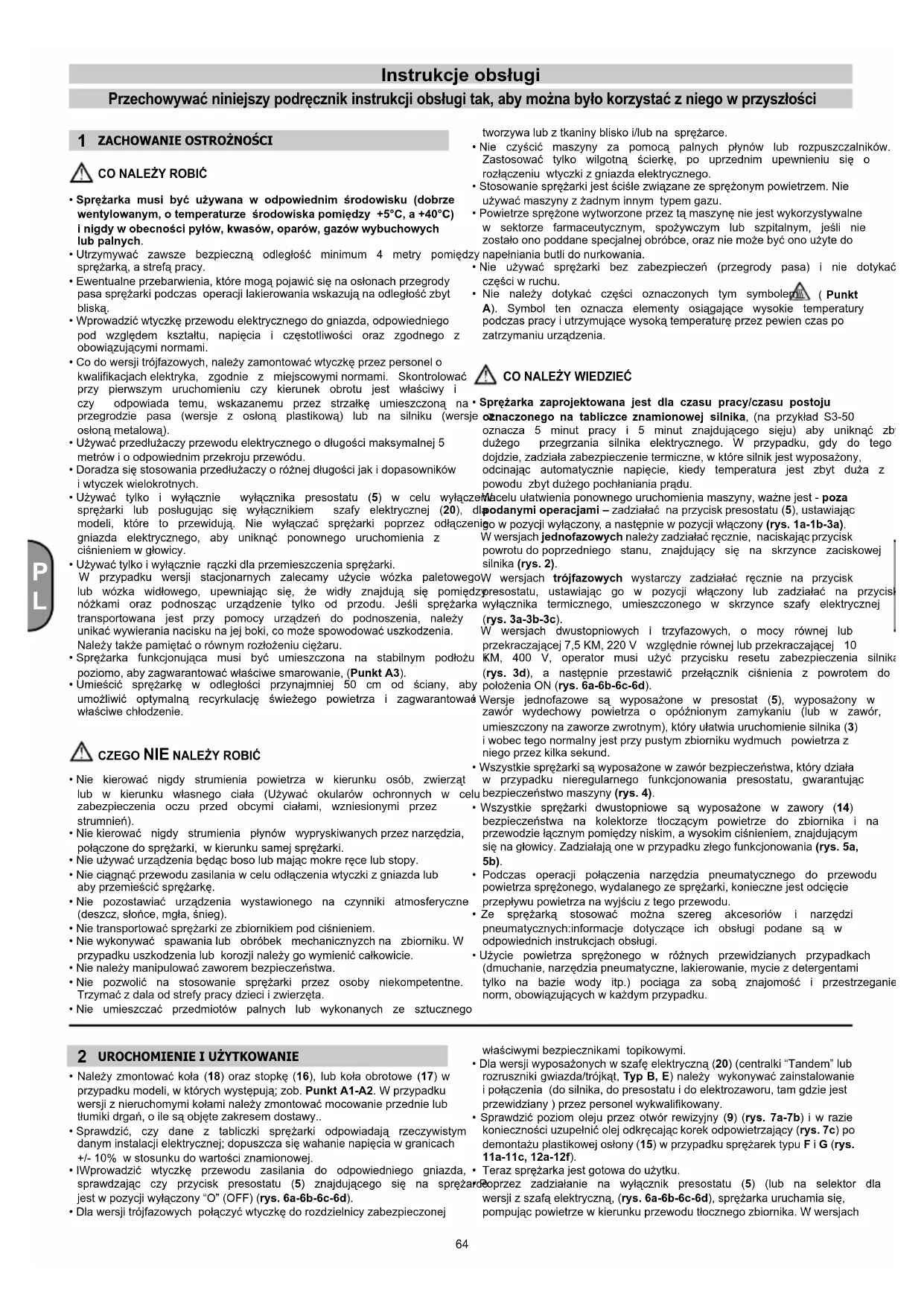 - Sprężarka musi być używana w odpowiednim środowisku (dobrze wentylowanym, o temperaturze środowiska pomiędzy +5°C, a +40°C) i nigdy w obecności pyłów, kwasów, oparów, gazów wybuchowych lub palnych.•Utrzymywać zawsze bezpieczną odległość minimum 4 metry pomiędzysprężarką,astrefąpracy.•Ewentualneprzebarwienia,któremogąpojawićsięnaosłonachprzegrodypasasprężarkipodczasoperacjilakierowaniawskazująnaodległośćzbytbliską.•Wprowadzićwtyczkęprzewoduelektrycznegodogniazda,odpowiedniegopod względem kształtu, napięcia i częstotliwości oraz zgodnego zobowiązującyminormami.•Codowersjitrójfazowych,należyzamontowaćwtyczkęprzezpersonelokwalifikacjachelektryka, zgodnie z miejscowyminormami. Skontrolowaćprzy pierwszym uruchomieniu czy kierunek obrotu jest właściwy iczy odpowiada temu, wskazanemu przez strzałkę umieszczoną naprzegrodzie pasa (wersje z osłoną plastikową) lub na silniku (wersje zosłonąmetalową).•Używaćprzedłużaczyprzewoduelektrycznegoodługościmaksymalnej5metrówioodpowiednimprzekrojuprzewódu.•Doradzasięstosowaniaprzedłużaczyoróżnejdługościjakidopasownikówiwtyczekwielokrotnych.•Używać tylko i wyłącznie wyłącznika presostatu (5) w celu wyłączeniasprężarki lub posługując się wyłącznikiem szafy elektrycznej (20), dlamodeli, które to przewidują. Nie wyłączać sprężarki poprzez odłączeniegniazda elektrycznego, aby uniknąć ponownego uruchomienia zciśnieniemwgłowicy.•Używaćtylkoiwyłącznierączkidlaprzemieszczeniasprężarki. W przypadku wersji stacjonarnych zalecamy użycie wózka paletowegolub wózka widłowego, upewniając się, że widły znajdują się pomiędzynóżkami oraz podnosząc urządzenie tylko od przodu. Jeśli sprężarkatransportowana jest przy pomocy urządzeń do podnoszenia, należyunikaćwywieranianaciskunajejboki,comożespowodowaćuszkodzenia.Należytakżepamiętaćorównymrozłożeniuciężaru.•Sprężarka funkcjonująca musi być umieszczona na stabilnym podłożu ipoziomo,abyzagwarantowaćwłaściwesmarowanie,(Punkt A3).•Umieścić sprężarkę w odległości przynajmniej 50 cm od ściany, abyumożliwić optymalną recyrkulację świeżego powietrza i zagwarantowaćwłaściwechłodzenie.