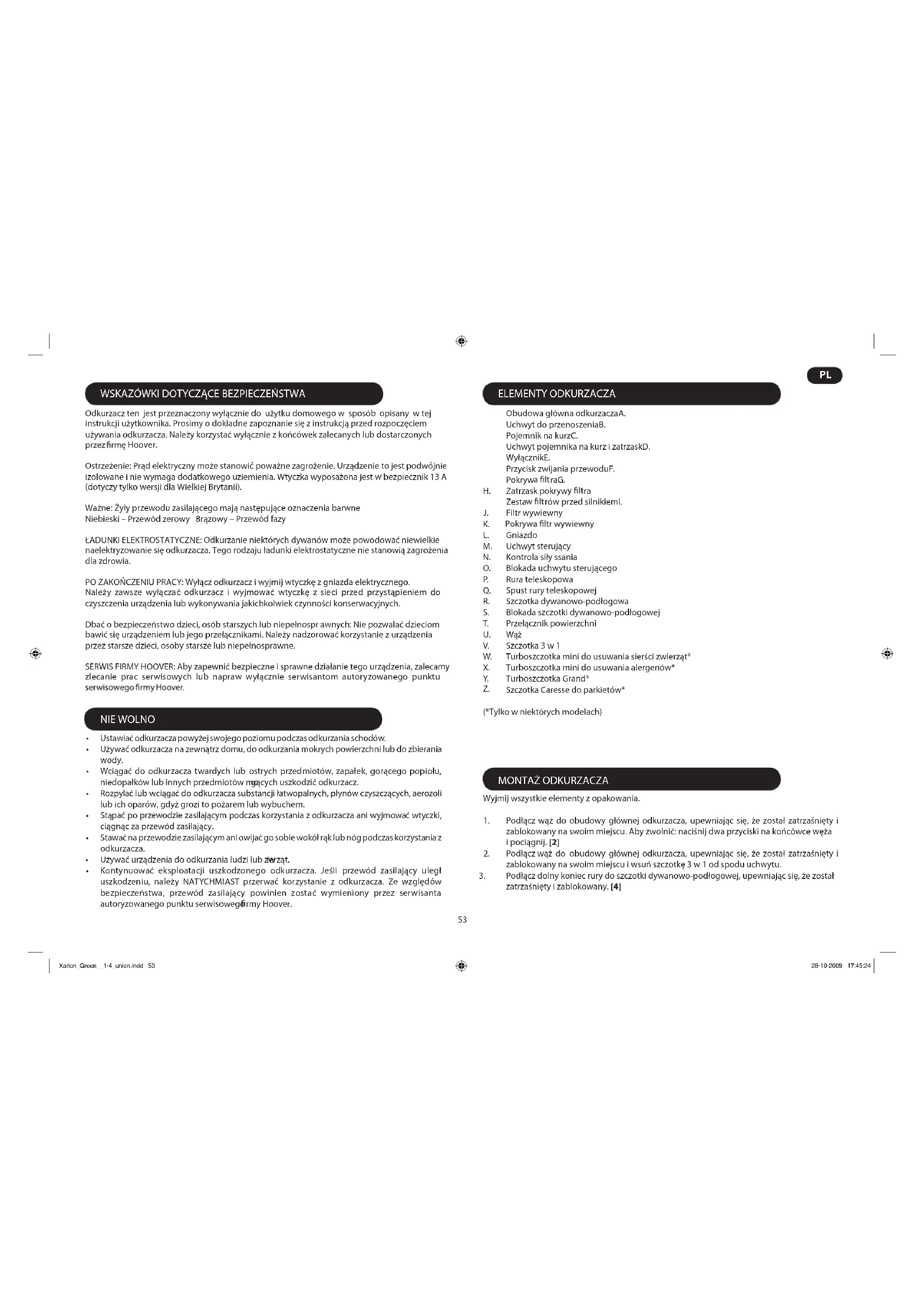 (*Tylko w niektórych modelach) Wyjmij wszystkie elementy z opakowania. Podłącz wąż do obudowy głównej odkurzacza, upewniając się, że został zatrzaśnięty i 1. zablokowany na swoim miejscu. Aby zwolnić: naciśnij dwa przyciski na końcówce węża i pociągnij. [2] Podłącz wąż do obudowy głównej odkurzacza, upewniając się, że został zatrzaśnięty i 2. zablokowany na swoim miejscu i wsuń szczotkę 3 w 1 od spodu uchwytu. Podłącz dolny koniec rury do szczotki dywanowo-podłogowej, upewniając się, że został 3. zatrzaśnięty i zablokowany. [4] Ustawiać odkurzacza powyżej swojego poziomu podczas odkurzania schodów.• Używać odkurzacza na zewnątrz domu, do odkurzania mokrych powierzchni lub do zbierania • wody. Wciągać do odkurzacza twardych lub ostrych przedmiotów, zapałek, gorącego popiołu, • niedopałków lub innych przedmiotów mo gących uszkodzić odkurzacz. Rozpylać lub wciągać do odkurzacza substancji łatwopalnych, płynów czyszczących, aerozoli • lub ich oparów, gdyż grozi to pożarem lub wybuchem. Stąpać po przewodzie zasilającym podczas korzystania z odkurzacza ani wyjmować wtyczki, • ciągnąc za przewód zasilający. Stawać na przewodzie zasilającym ani owijać go sobie wokół rąk lub nóg podczas korzystania z • odkurzacza. Używać urządzenia do odkurzania ludzi lub zw ierząt.• Kontynuować eksploatacji uszkodzonego odkurzacza. Jeśli przewód zasilający uległ • uszkodzeniu, należy NATYCHMIAST przerwać korzystanie z odkurzacza. Ze względów bezpieczeństwa, przewód zasilający powinien zostać wymieniony przez serwisanta autoryzowanego punktu serwisowego rmy Hoover. Xarion_Green__1-4_union.indd 53 28-10-2009 17:45:24 Z.54